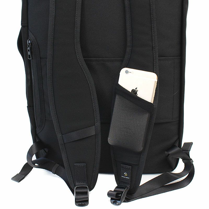 ショルダーストラップの片側には、ワイヤレスヘッドホンやICカードの収納に便利なストレッチ素材のメッシュポケットを装備しています。
