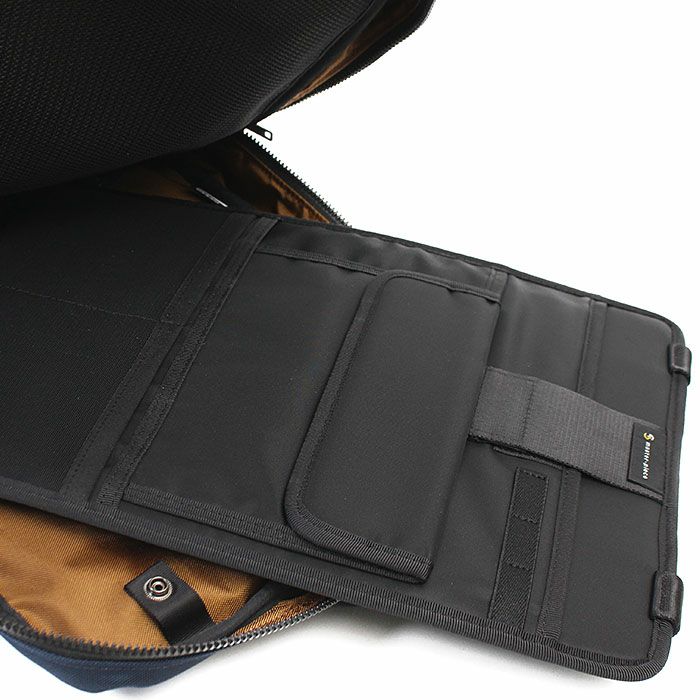 フロント下部のファスナーポケットの袋布には撥水・防水性に優れた軽量な3レイヤーナイロン、底部分にはPVCメッシュを使用しているのでペットボトルや折りたたみ傘の収納に便利です。