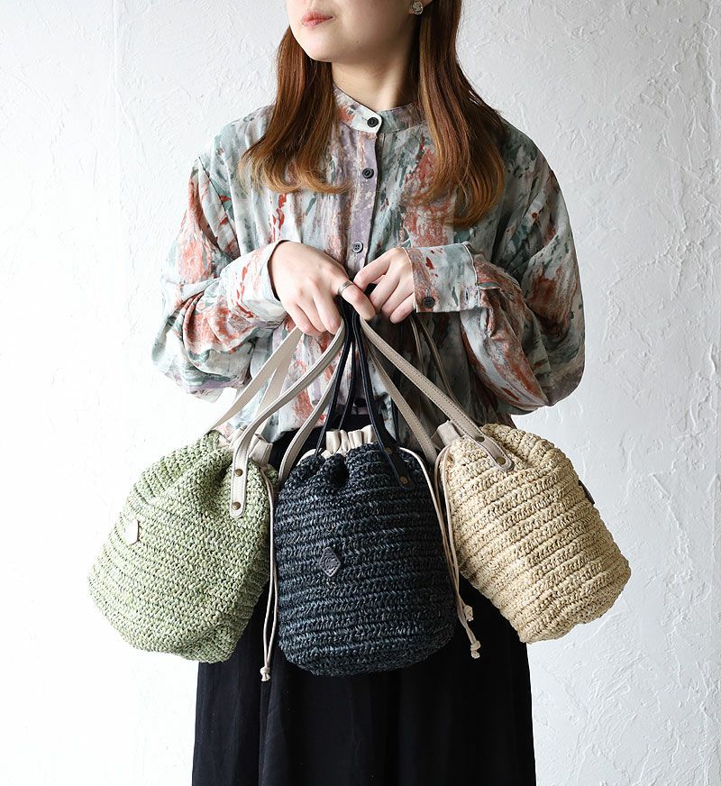 ■口元をきゅっと縛るタイプのカゴバッグ。
