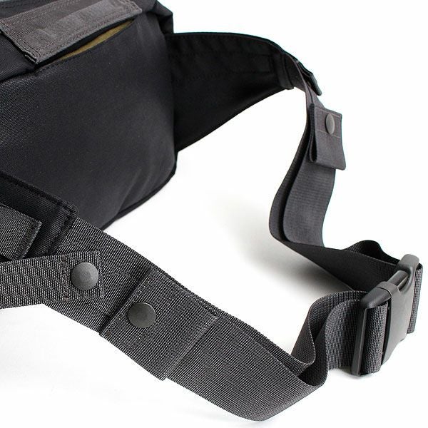 こちらは定番型の一つである大容量のウエストバッグです。テープ部分の調節は“FLYING SUIT / TYPE K-2A”のウエスト部分のアジャスターから着想を得て、3段階でホック留めする仕様を採り入れました。スマートフォンやウォレットはもちろん、500mlペットボトルも収納できる実用的なウエストバッグです。