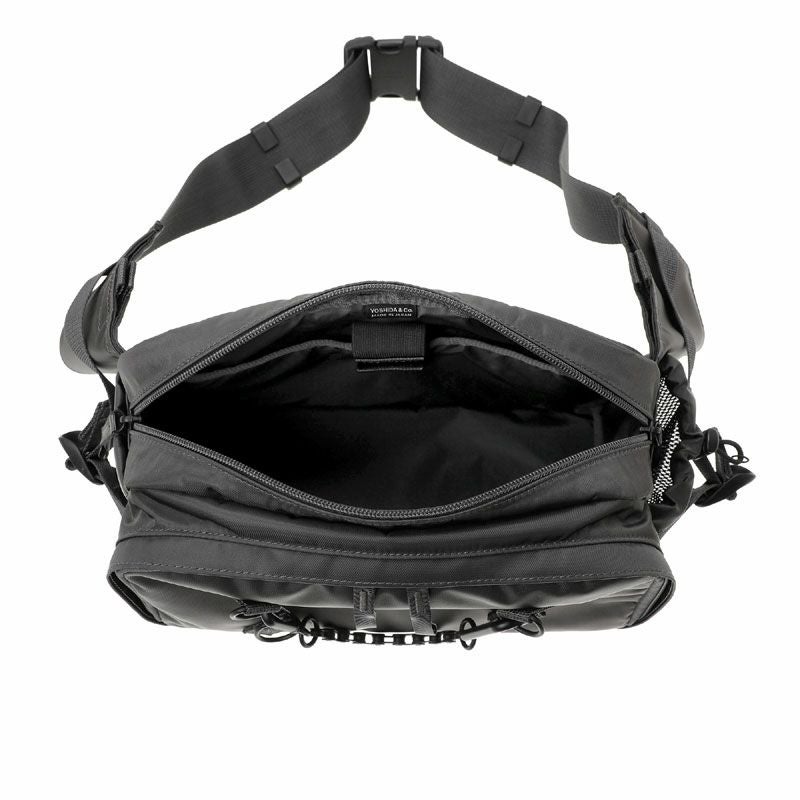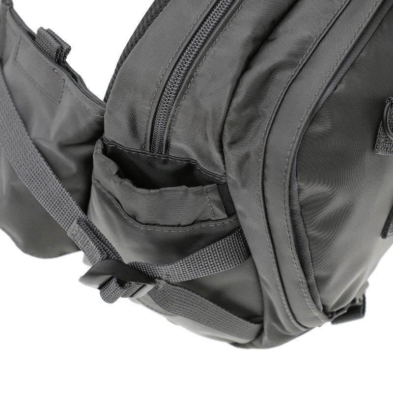 ウエストバッグは大容量のメイン収納部と、ウォレットやスマートフォンの収納に便利な前層部を備えた2層式のアイテムです。メイン収納部の内装には11inchのiPadが収納できるクッション材入りのポケットを設けています。サイドのポケットには口元に伸縮性のある素材を採用したポケットと、メッシュ素材のポケットを備えました。ハーネス部分のポケットにはワイヤレスイヤホンなどが収納可能です。