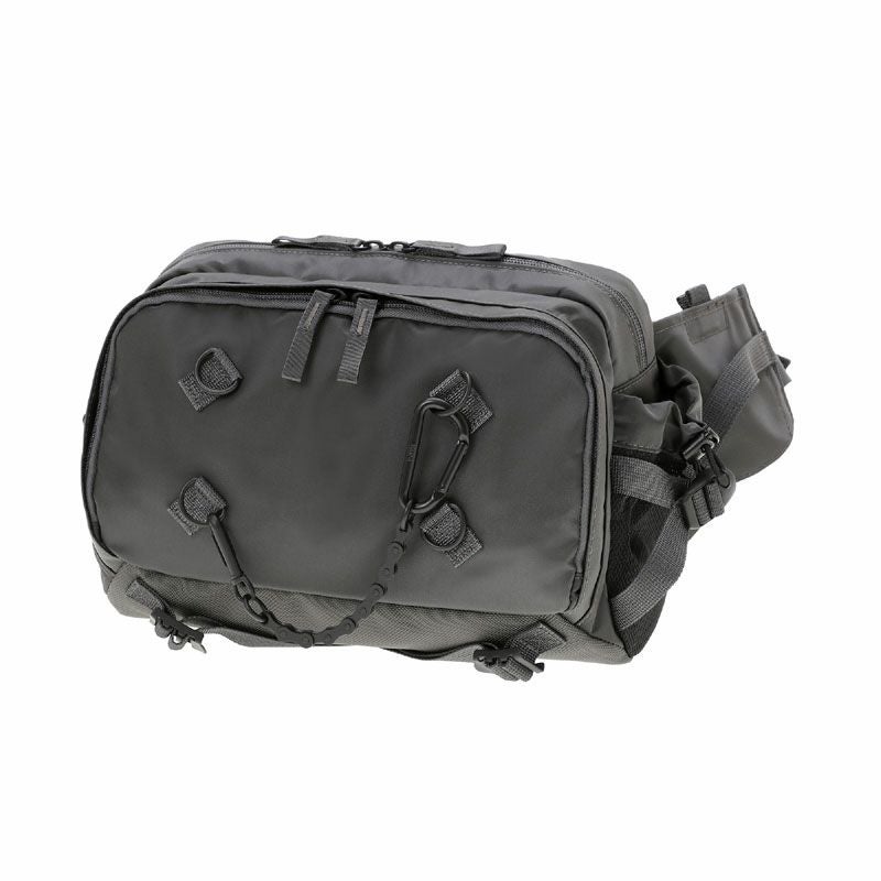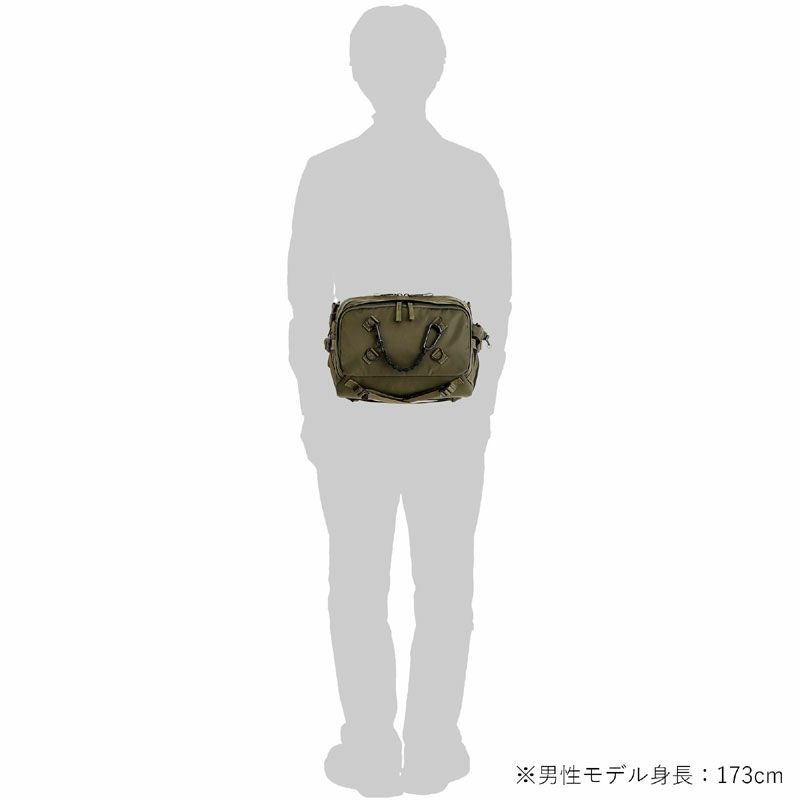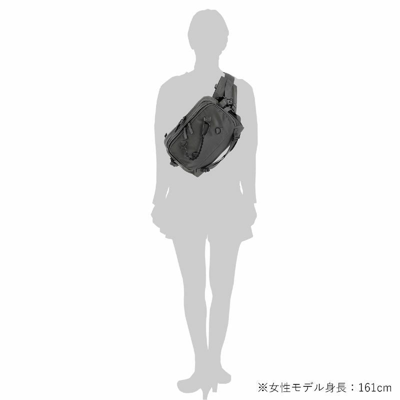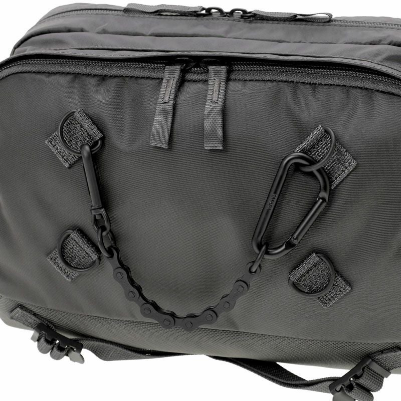 メイン素材にナイロンツイル生地を使用しており、PVC加工を施すことで耐水性を高めています。負荷のかかりやすい底マチ部分にはコーデュラバリスティックナイロンを採用し、耐久性も上げました。本体の前面や底面に身の回りのものを簡易的に固定して持ち運ぶことができるスリングバインダーも配しています。バックパックやウエストバッグはテープをクロスさせることで、見た目のアクセントにしました。ショルダーストラップはワンアクションで滑らかな調節が可能な画期的な仕様です。