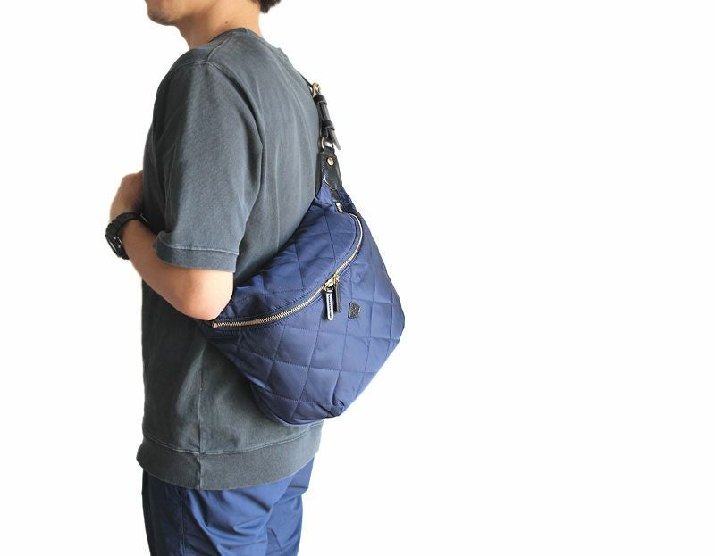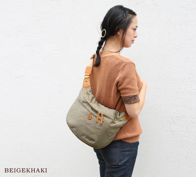 本体にはキルティング素材、細部にはレザーを使用することにより、ボディバッグでもカジュアル過ぎず上品な仕上がりに。