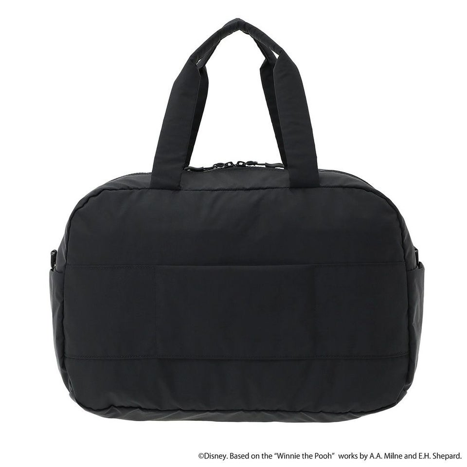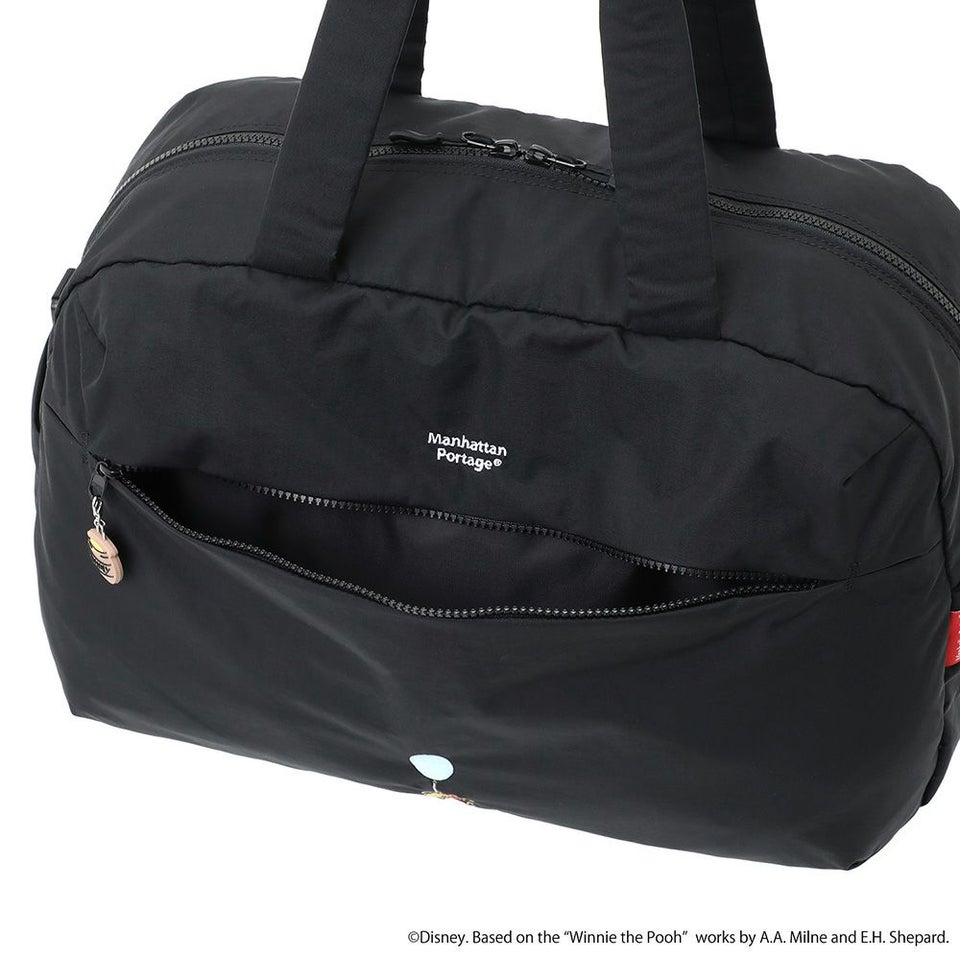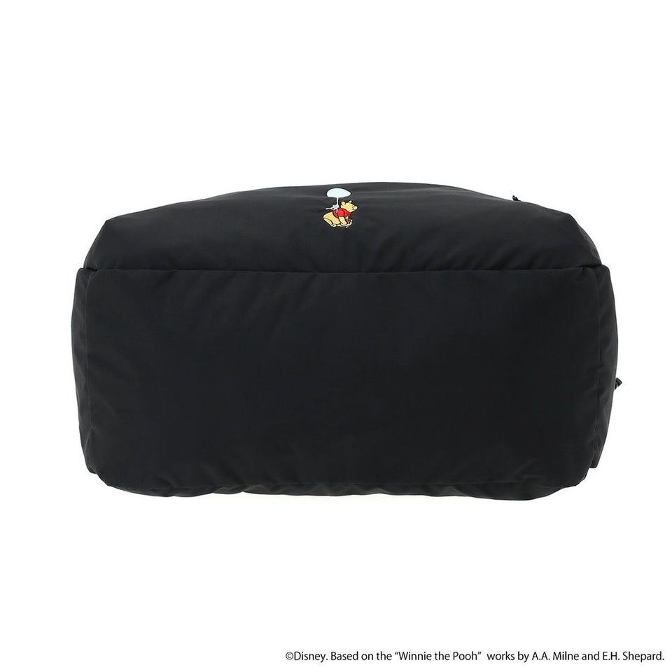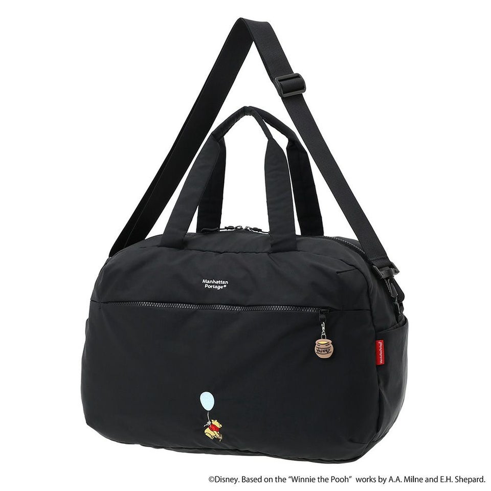 風船につかまれて空を飛ぶほのぼのとした「プーさん」のアートワークが目を引くボストンバッグ。