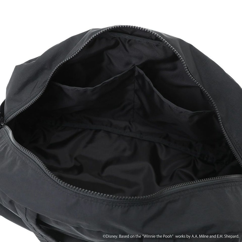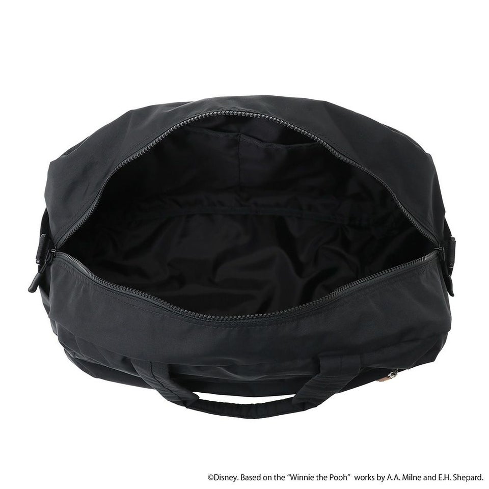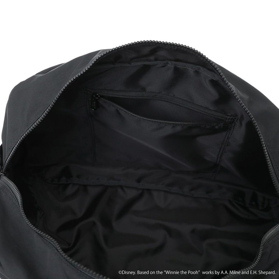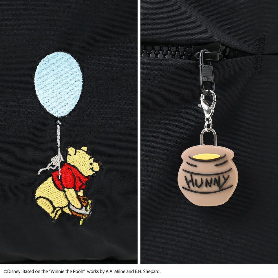 風船につかまれて空を飛ぶほのぼのとした「プーさん」のアートワークが目を引くボストンバッグ。