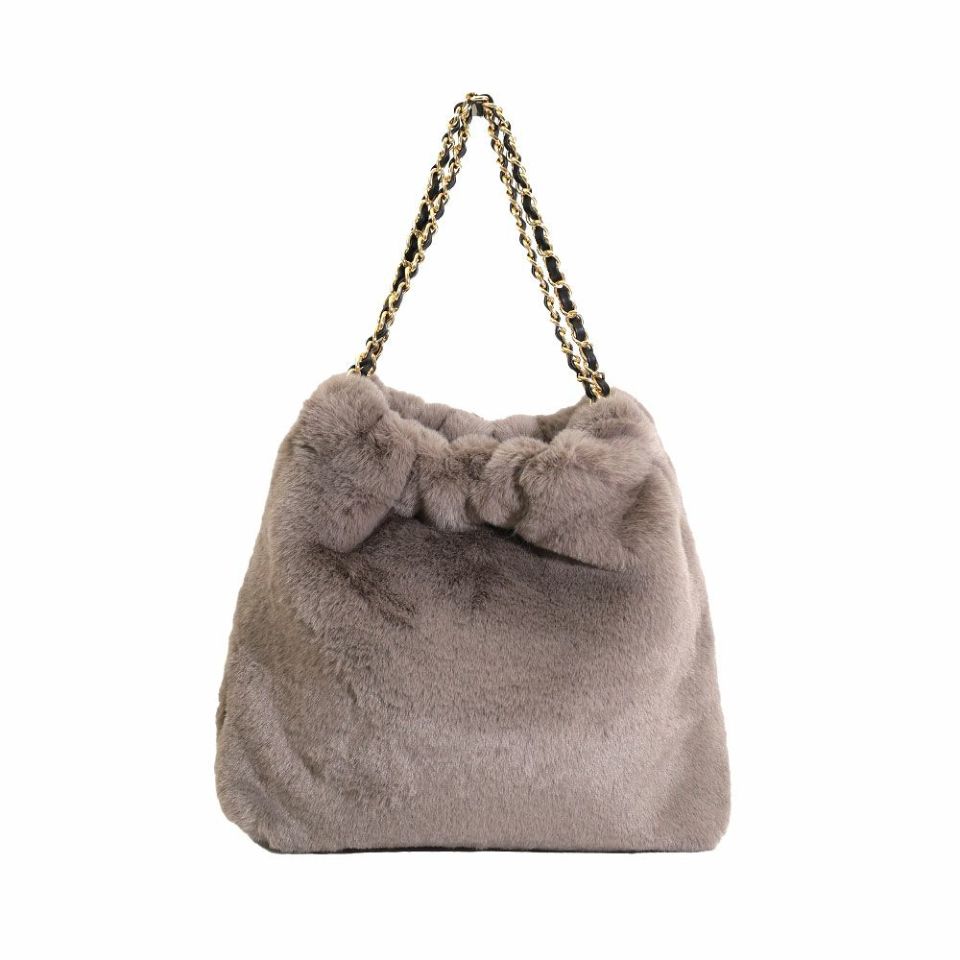 持ち手には上品なチェーン使い。光沢のあるファー素材と好相性で、きれいめスタイルにも合わせやすい大人のためのデザインです。