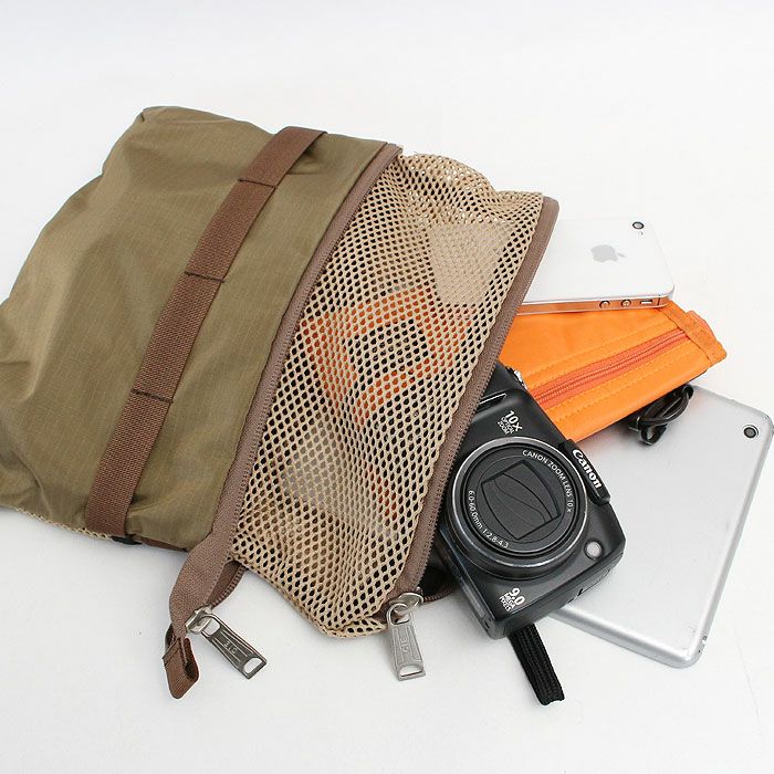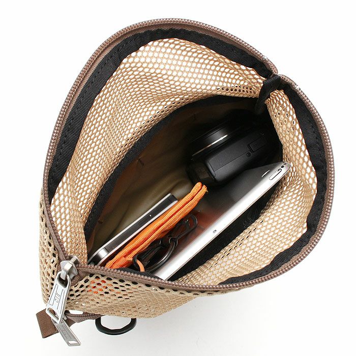 取り出し口にはメッシュのフラップがついており、広げて使用すると容量が増えます。フラップ部分は収納したり、上に出したままにしておいたり、折ったりと見た目のアレンジも楽しめます。