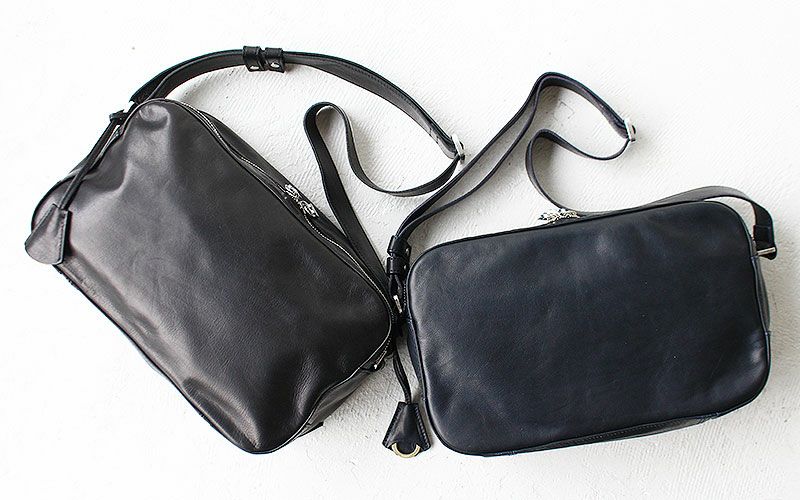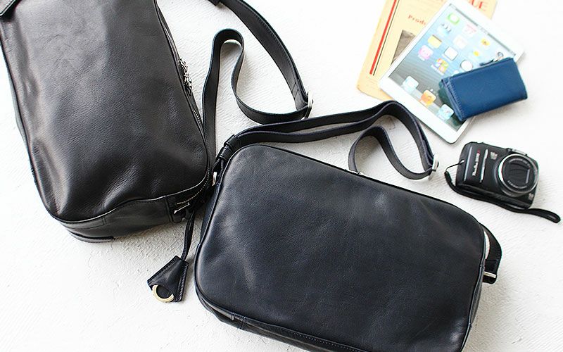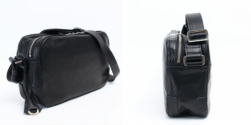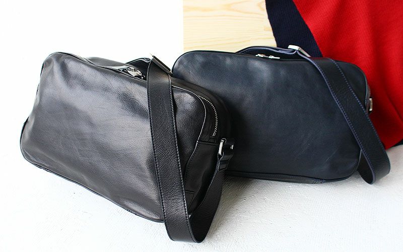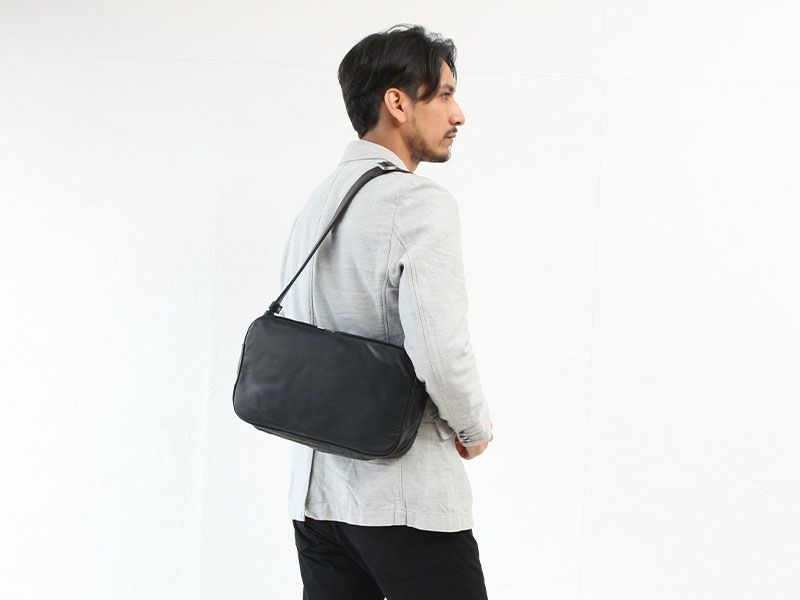 スポーティなショルダーバッグのデザインながら カジュアル感を取り除くべくストラップにはレザーを使用しています。