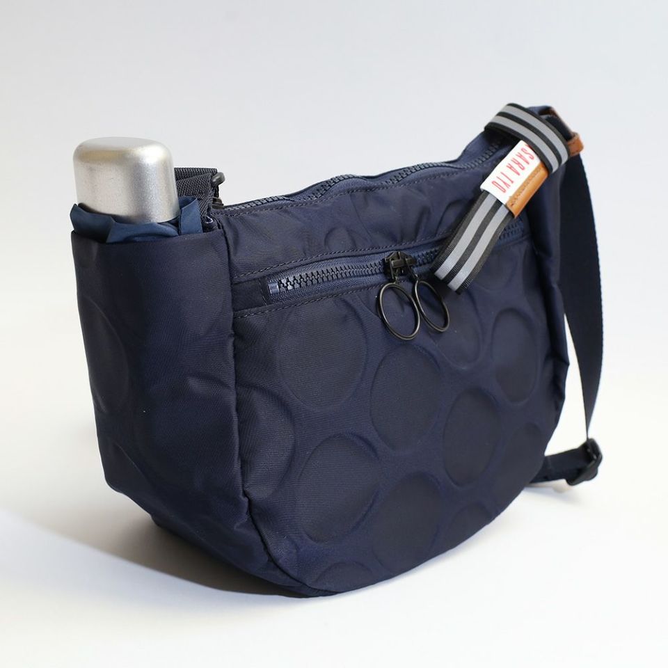 小さすぎず大きすぎない、絶妙サイズの舟形ショルダーバッグ。マチが下に向かって広がるデザインで、500mlペットボトルや長財布が横向きですっと入る使いやすさも魅力です。