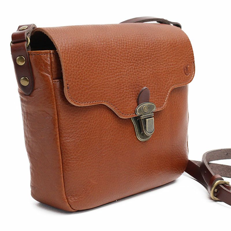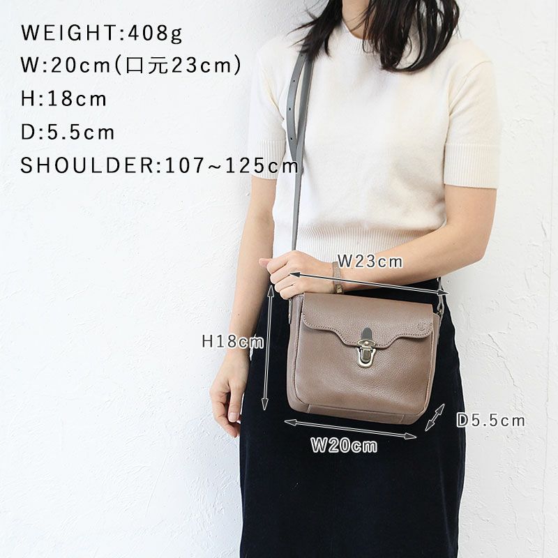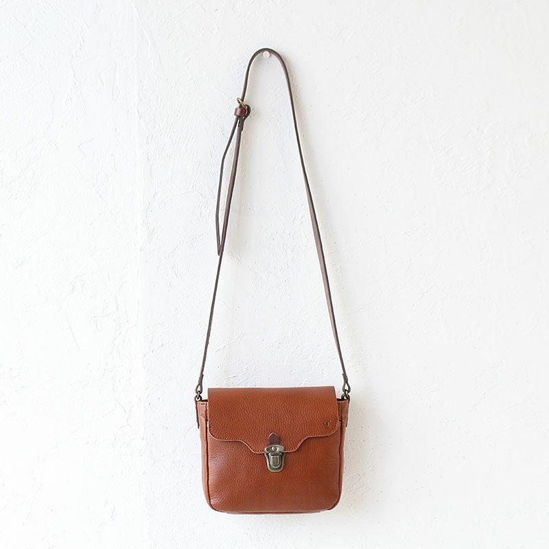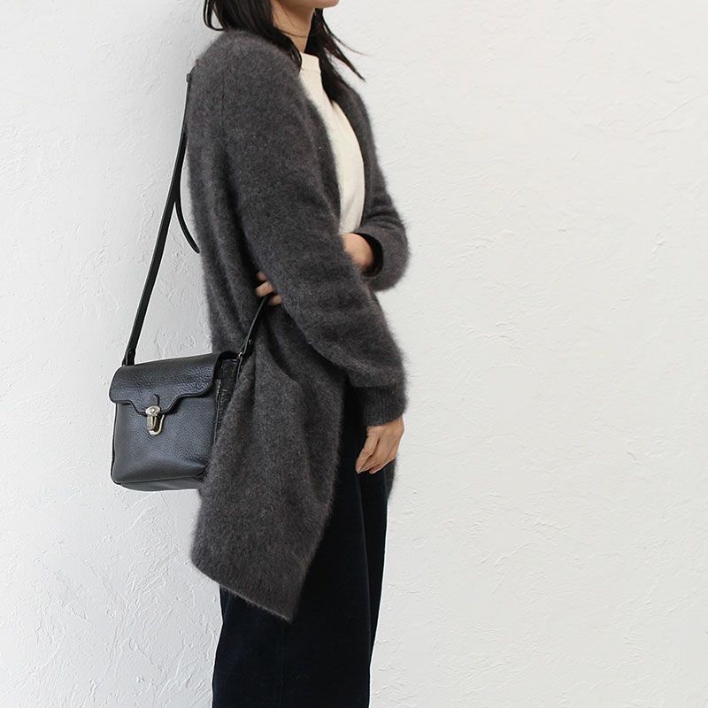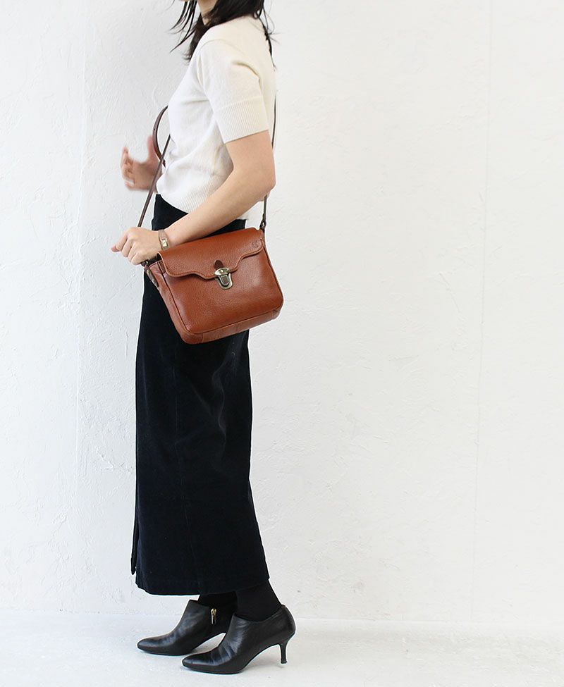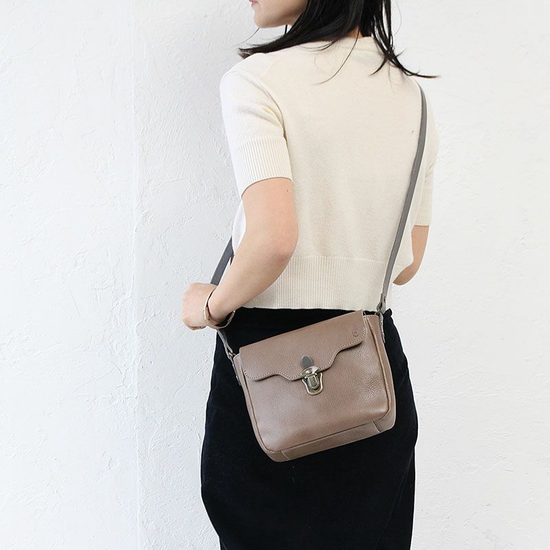 アンティークなムード漂う柔らかな曲線で描かれたフラップに差し込み錠、コーディネートに品よく寄り添うサイズ感です。