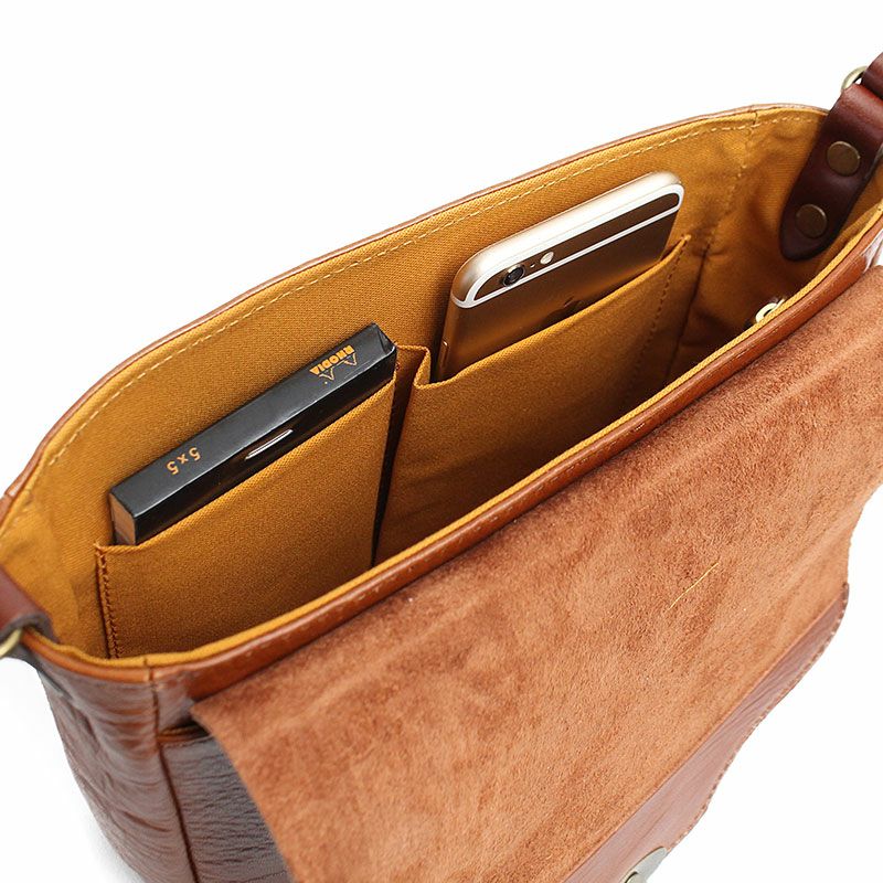 片方のオープンポケットには厚みのある小物も収納できるように片マチを付けています。