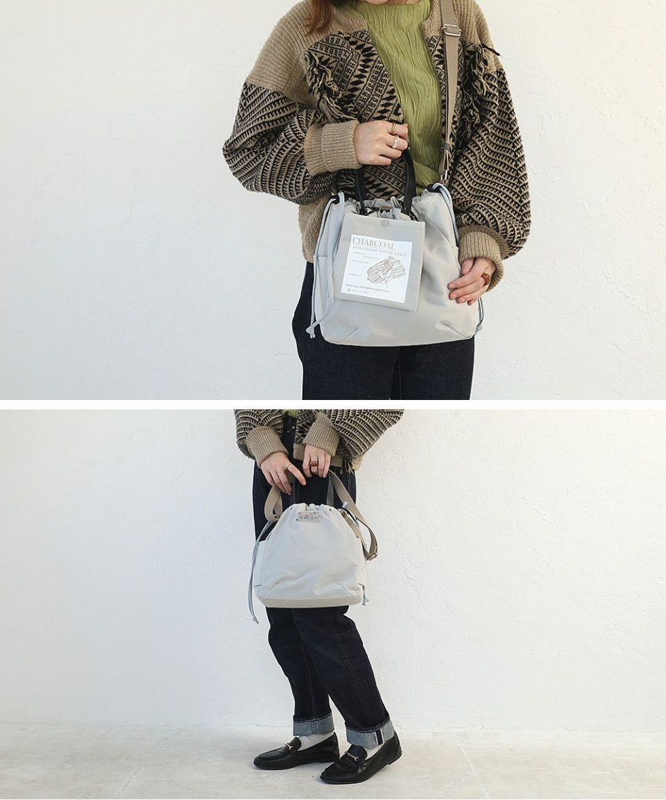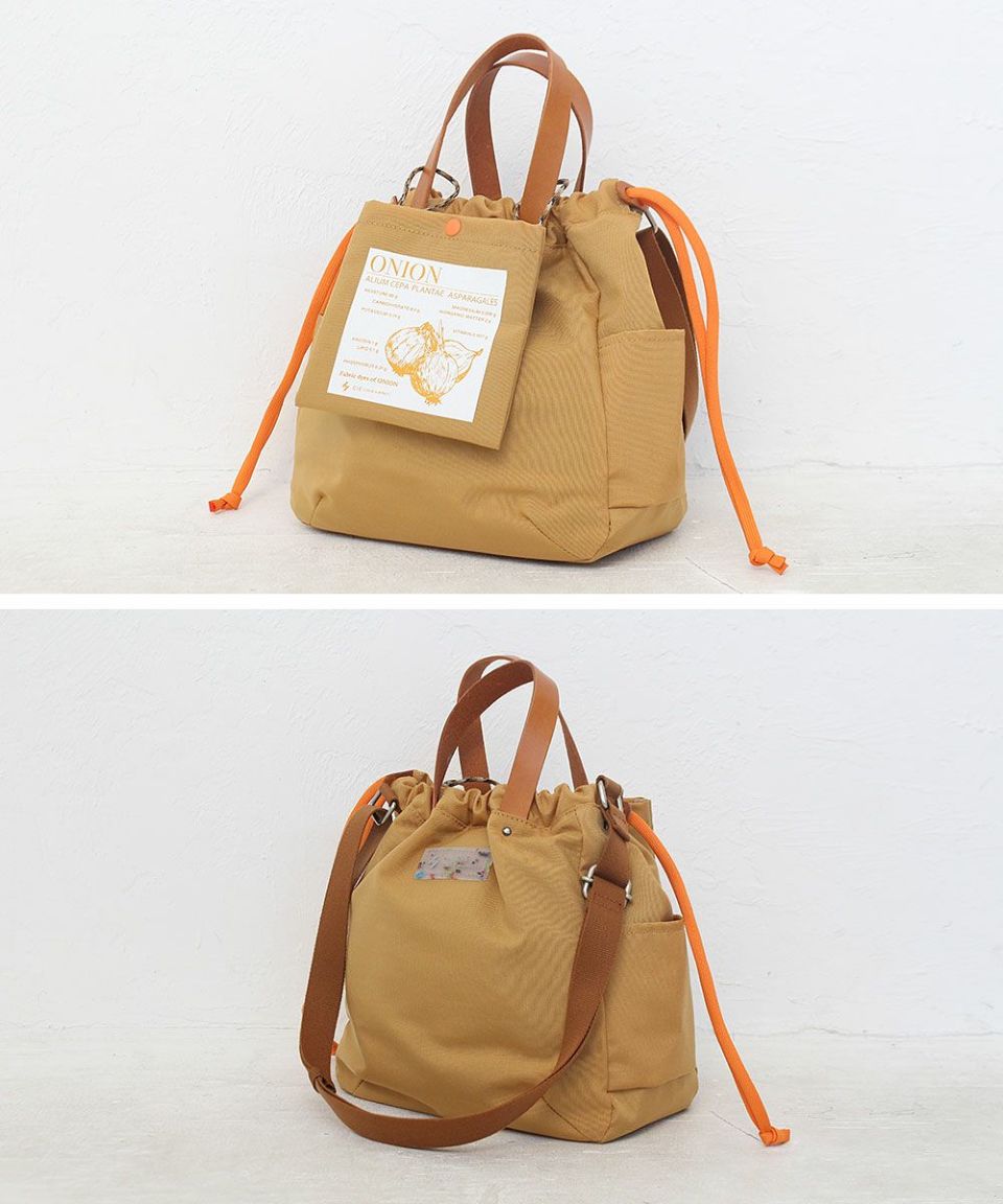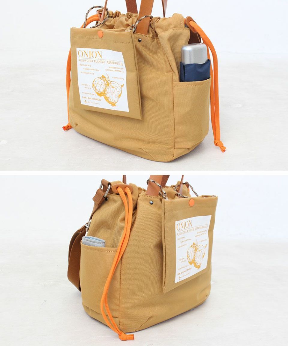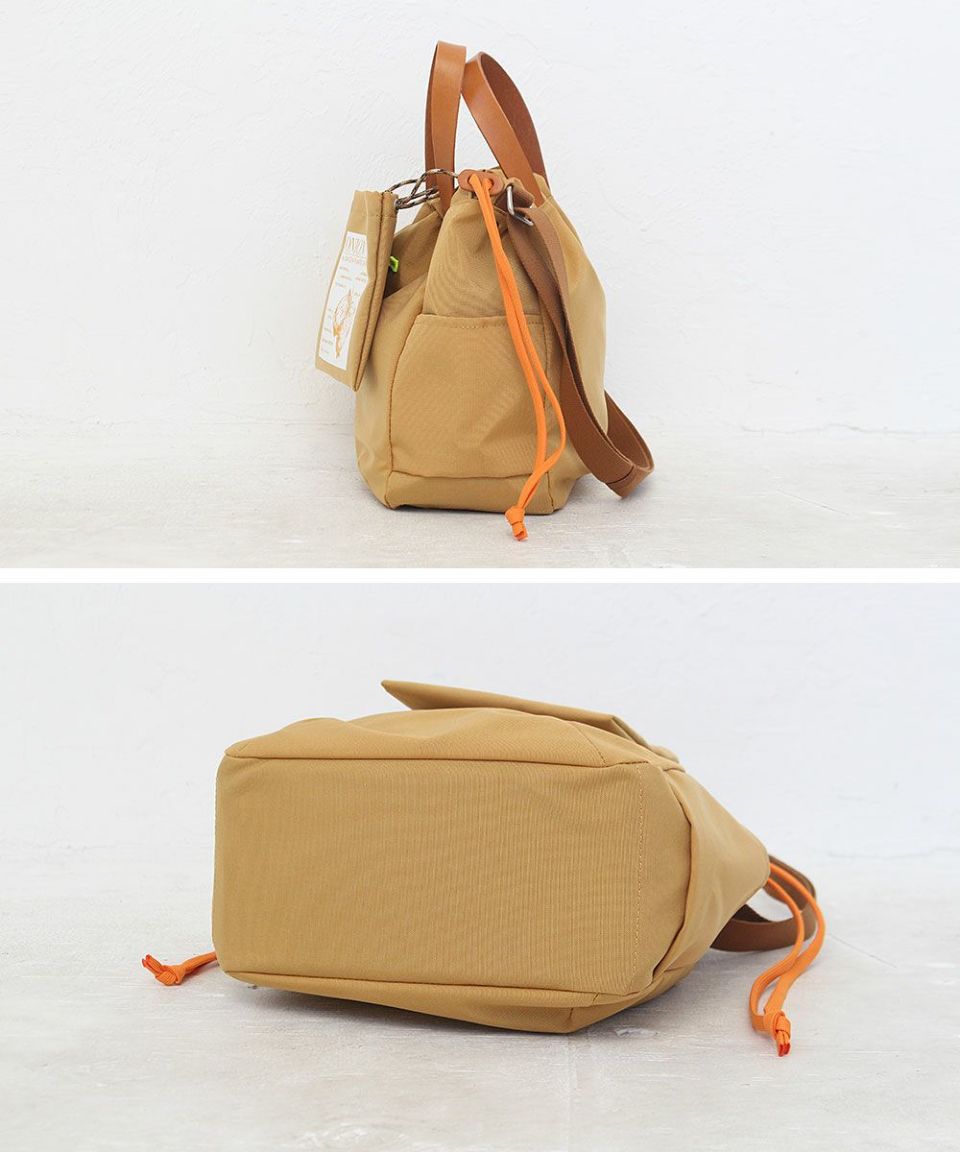 バッグの上部が巾着になっており、スピンドルコードもリサイクルポリエステルを使用しており、巾着にする事でスタイリングに併せた使い方ができます。