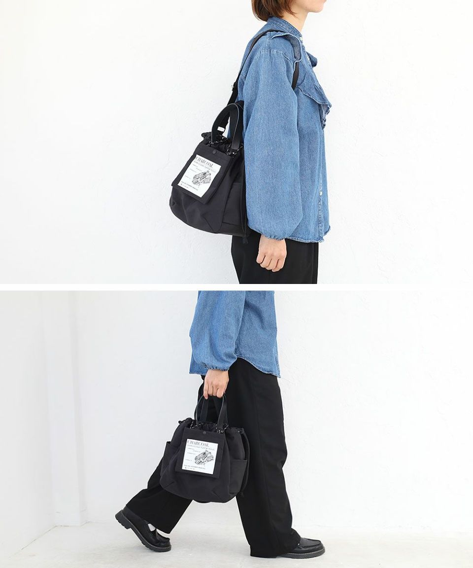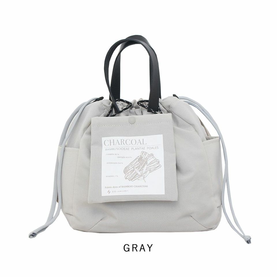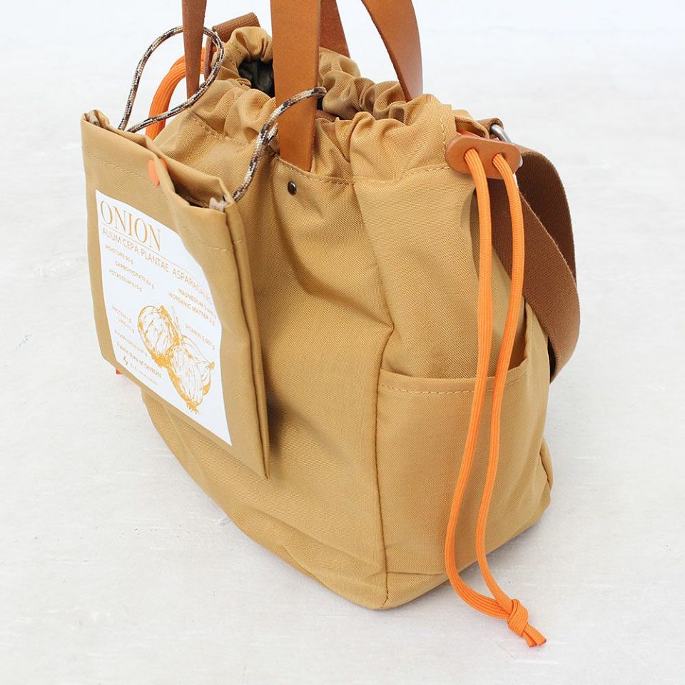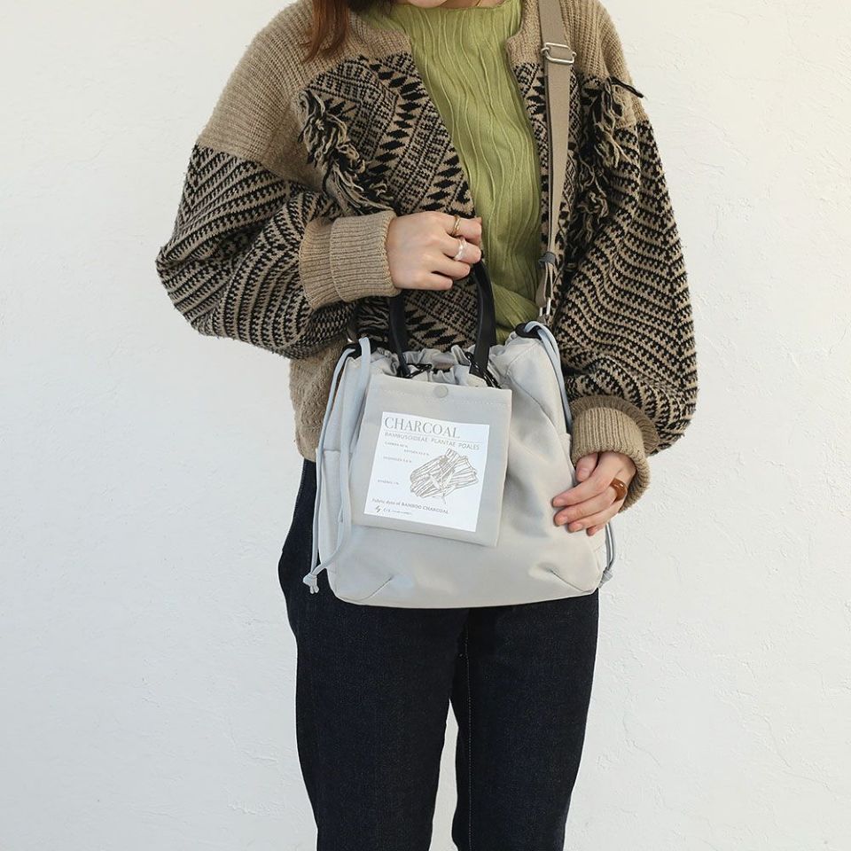 バッグの上部が巾着になっており、スピンドルコードもリサイクルポリエステルを使用しており、巾着にする事でスタイリングに併せた使い方ができます。