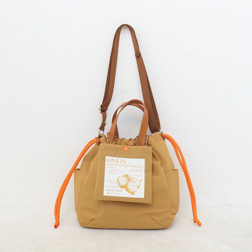 本体生地は、タスラン加工糸を使用したコットンライクなナイロンのベースに、タマネギの外皮から抽出されたケルセチンをベースに、様々な植物たち(オリーブの葉や、ぶどうの絞り殻、お米のもみ殻、竹炭等)の天然成分を配合し、染料として仕上げ生地染色をしております。