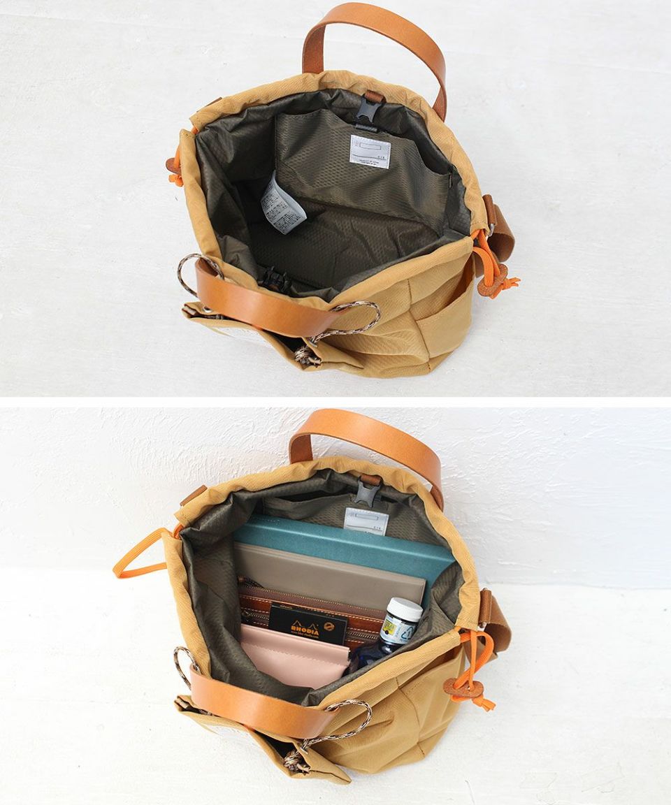 バッグの上部が巾着になっており、こちらのスピンドルコードもリサイクルポリエステルを使用しており、巾着にする事でスタイリングに併せた使い方ができます。