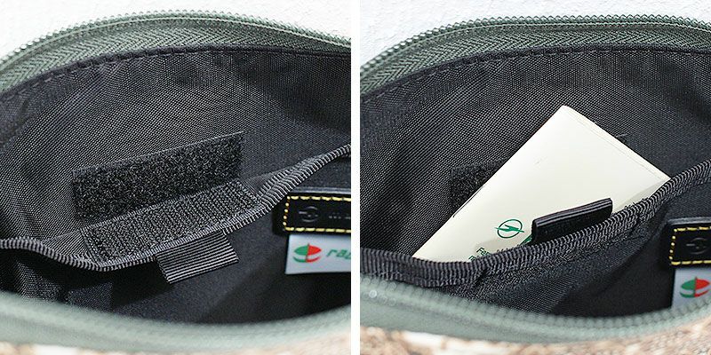 レザー素材の面ファスナー付きのメッシュポケットが施されています。