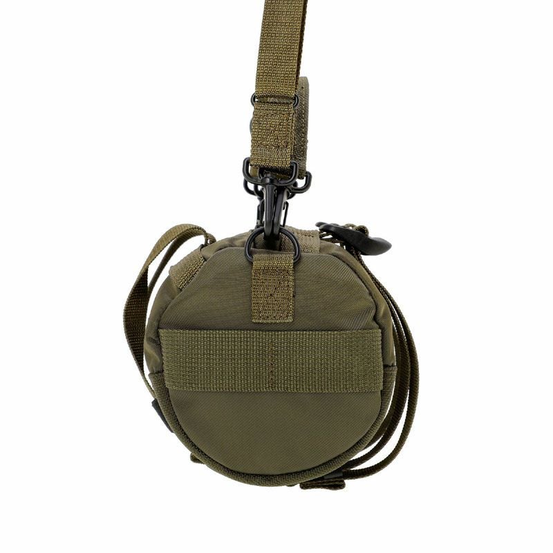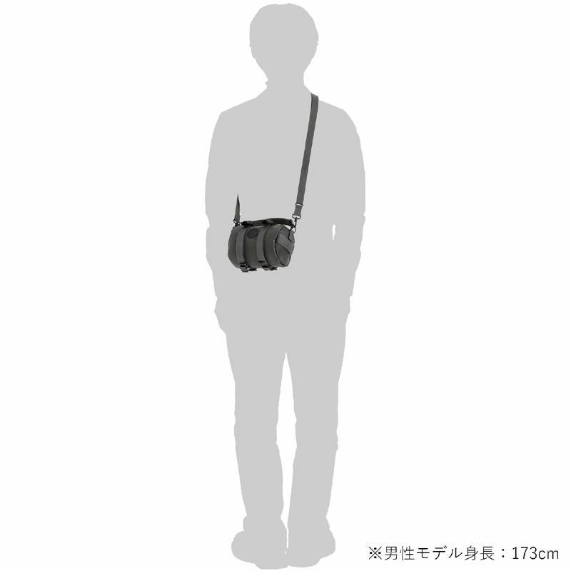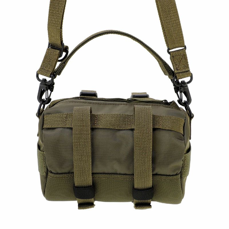 メイン素材にナイロンツイル生地を使用しており、PVC加工を施すことで耐水性を高めています。負荷のかかりやすい底マチ部分にはコーデュラバリスティックナイロンを採用し、耐久性も上げました。本体の前面や底面に身の回りのものを簡易的に固定して持ち運ぶことができるスリングバインダーも配しています。バックパックやウエストバッグはテープをクロスさせることで、見た目のアクセントにしました。ショルダーストラップはワンアクションで滑らかな調節が可能な画期的な仕様です。