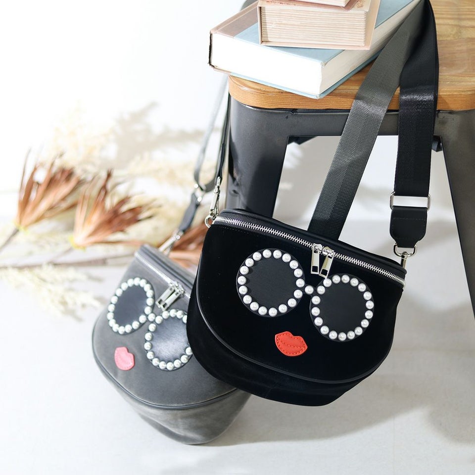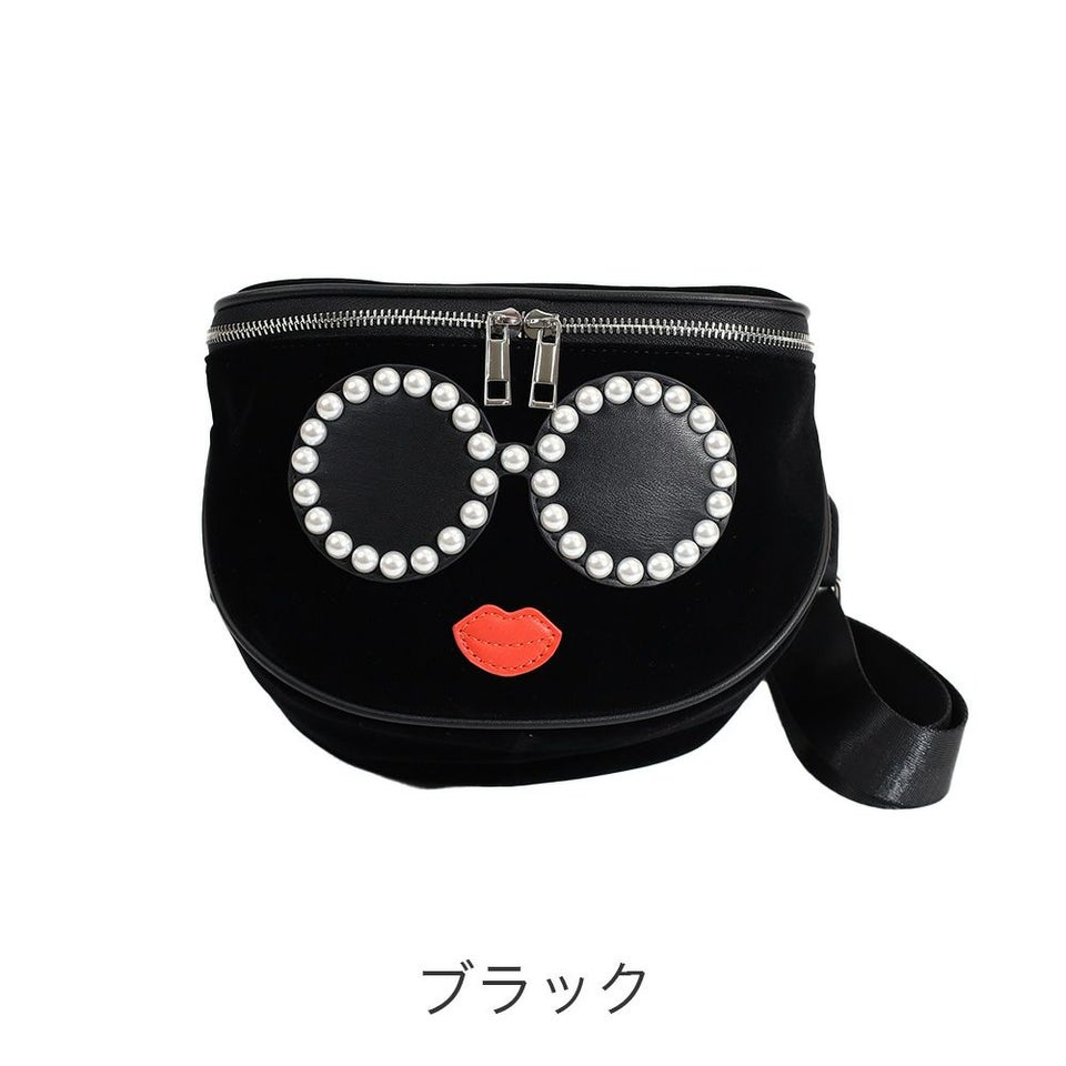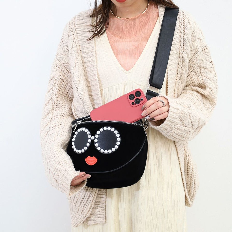 a-jolieらしいユニークな“顔”デザインに、パールで縁取られた大きなサングラスがアクセント。見た目のインパクトも抜群で、持つだけで気分が上がります。