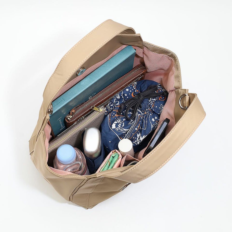 財布やスマートフォン、ポーチ類に加え、お弁当箱も収納できる実用的なサイズ感。荷物が多くなりがちな日でも無理なく持ち運べ、通勤やお出かけなど幅広いシーンで活躍します。見た目以上の収納力が魅力です。