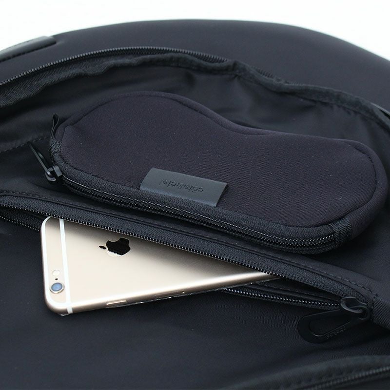 スマートでありながら、必要なシチュエーションでは容量調整が出来る上に、付属のメガネケースはネオプレーン素材であり、取り外しも可能なため、電子機器の収納ポーチやペンケースとしても活躍してくれます。