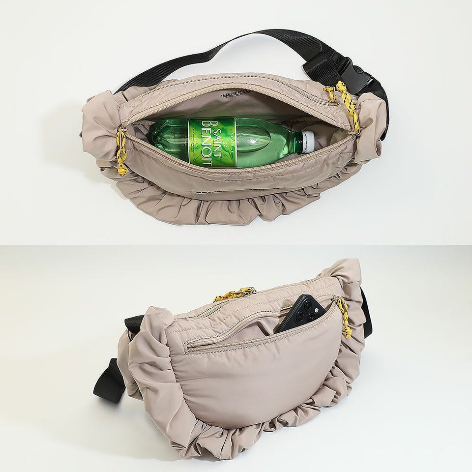 フリルがさりげないアクセントになり、シンプルな装いも華やかに。ショルダー調節もでき、肩掛け・斜め掛けどちらも楽しめます。