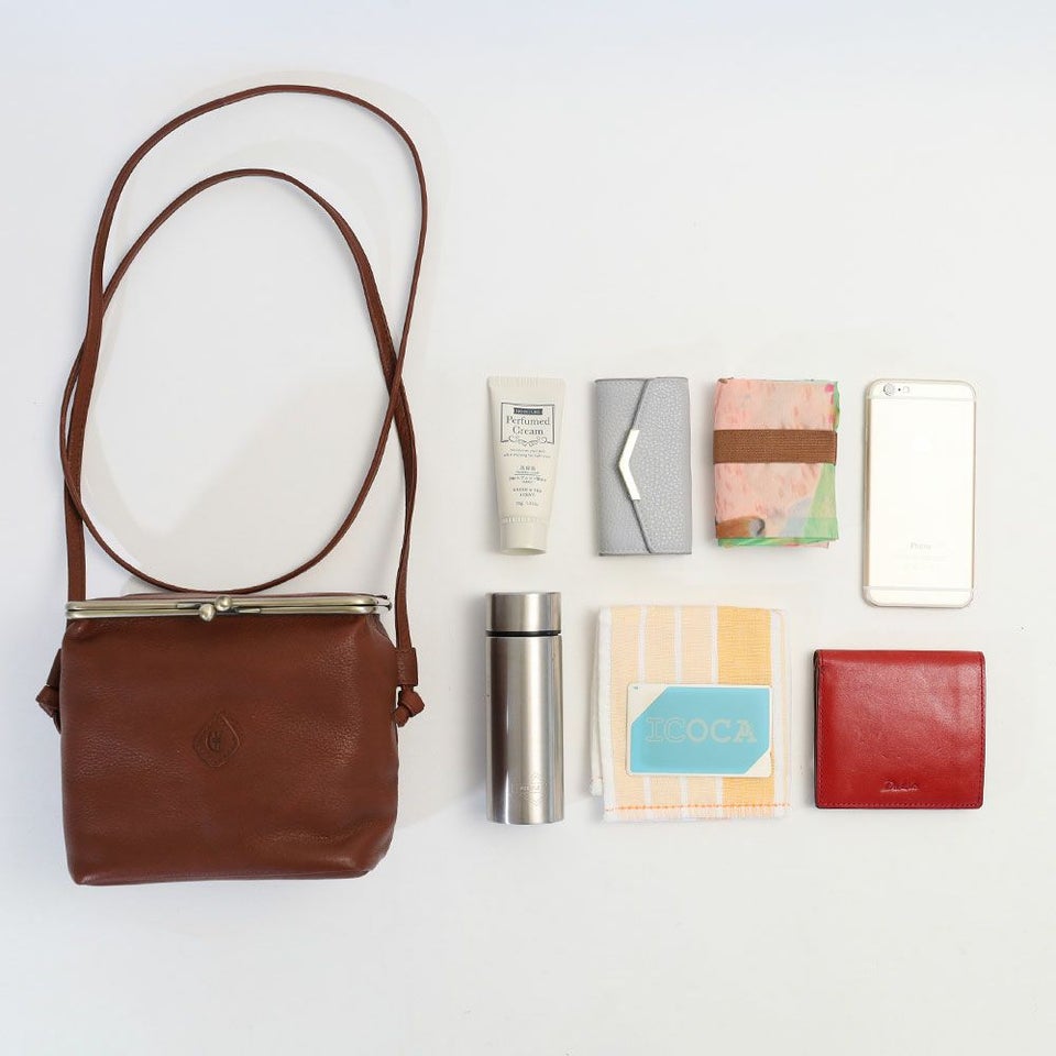 例として、二つ折り財布、ミニタンブラー、文庫本、スマートフォン、キーケース、ハンカチが収まりました。