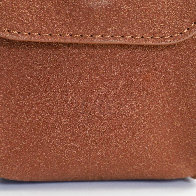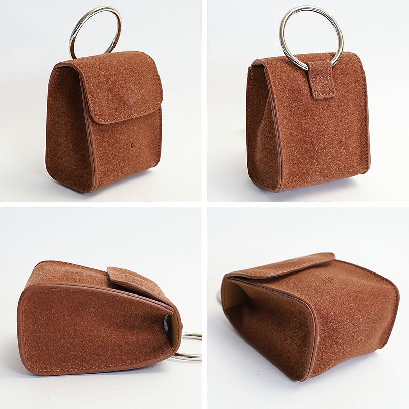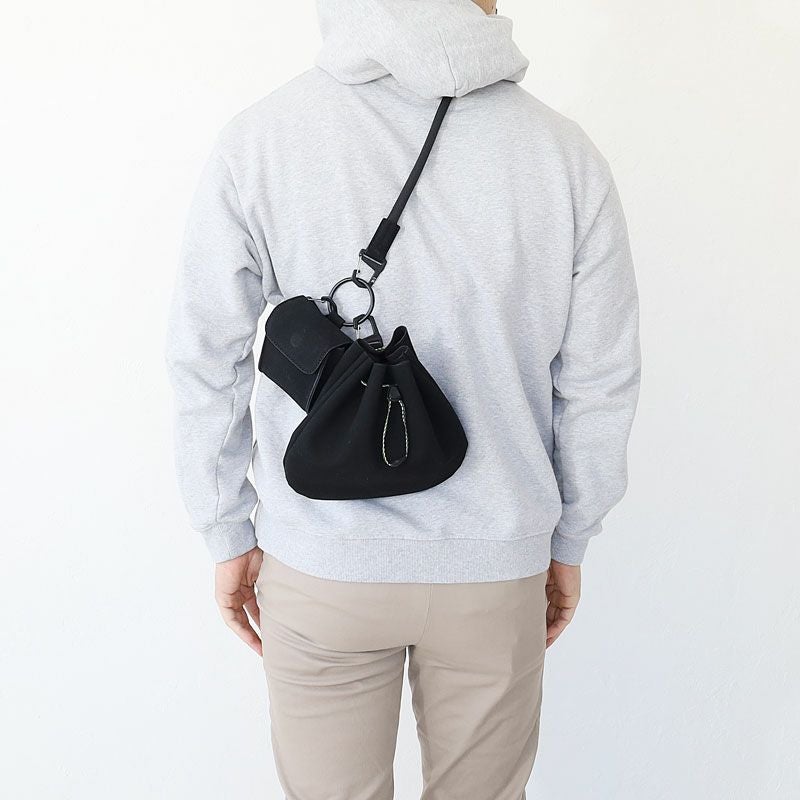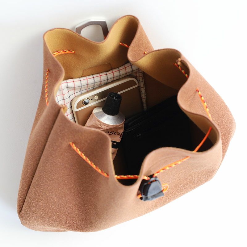 エコテックレザーコレクションのスエード調の新素材を使用したドローストリングバッグ。