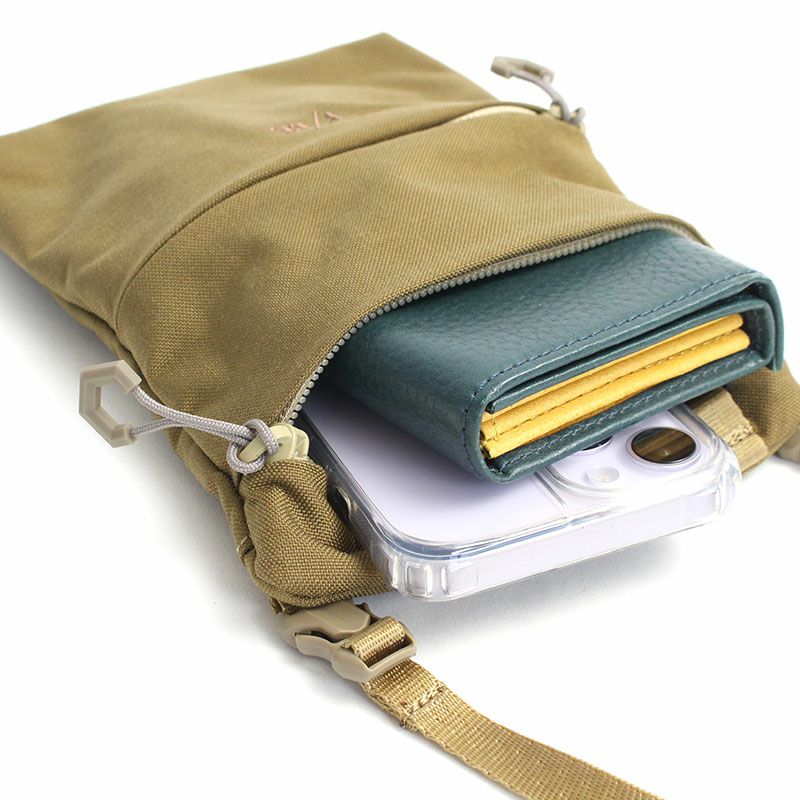 縦型のミニポシェット。旅先やチケットの収納、携帯の収納などを考慮したサイジングで、ショルダーはイージーアジャストシステムになっています。