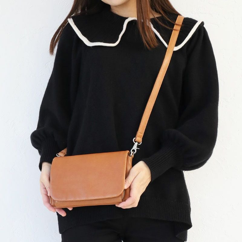 開閉部分をすっぽり覆う、フラップタイプのお財布ショルダー。