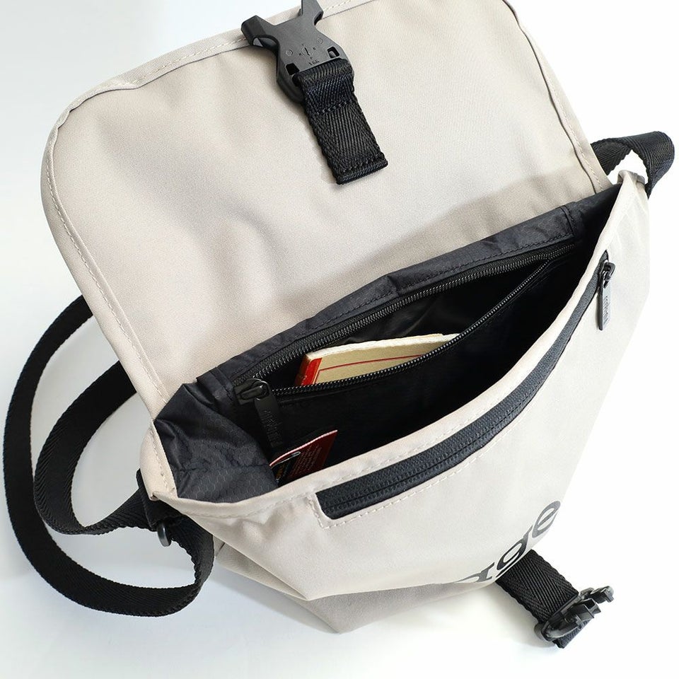 ・フラップ、ボディのフロント部、メインコンパートメント内側にそれぞれジッパー付きポケットを装備。
