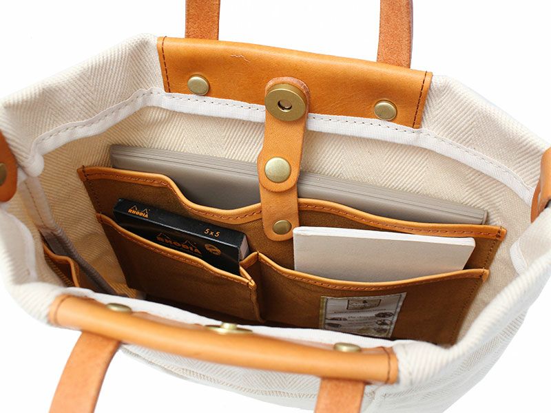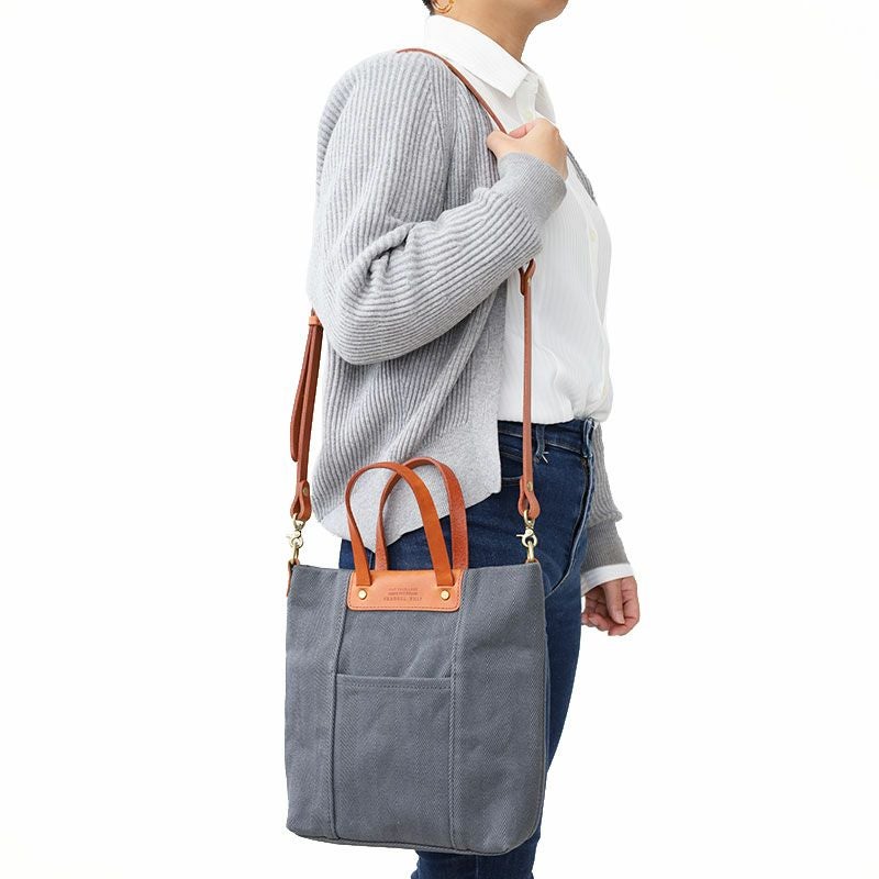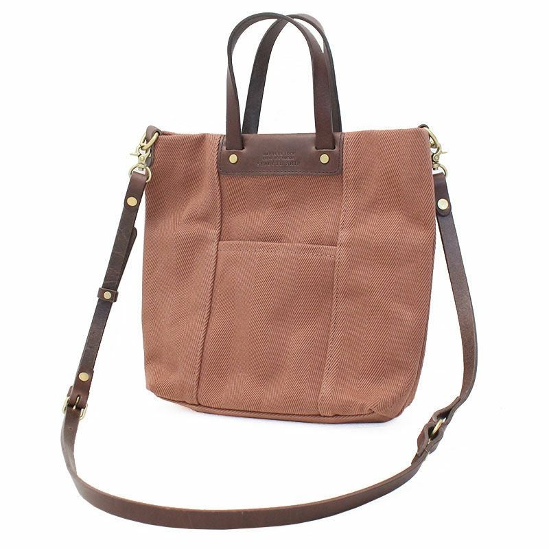 本体には岡山県倉敷で生まれたヘリンボーン生地を採用。とてもハリがあり、しっかりとしています。ディティールにはカジュアルな生地感と相性がの良いヌメ革を使用し、大人カジュアルなスタイルを演出します。