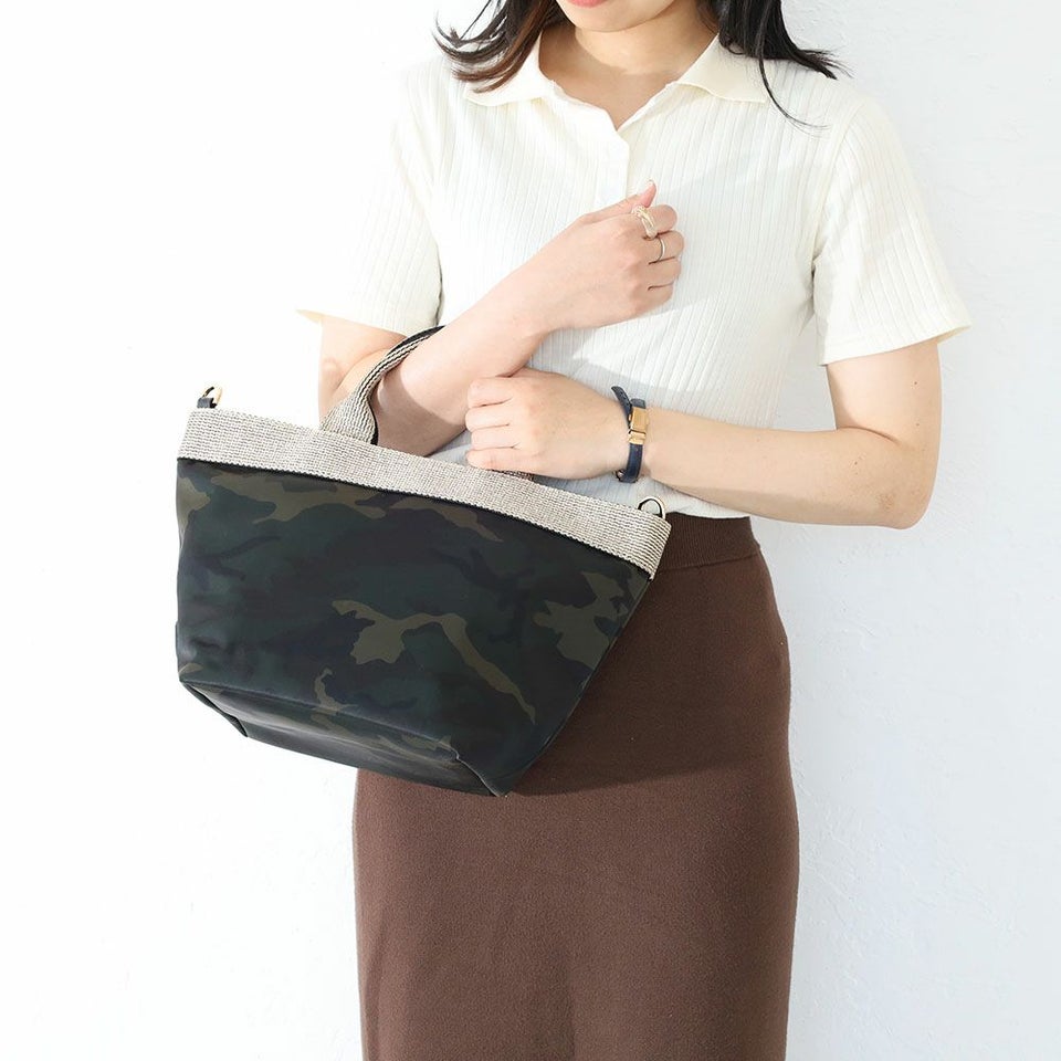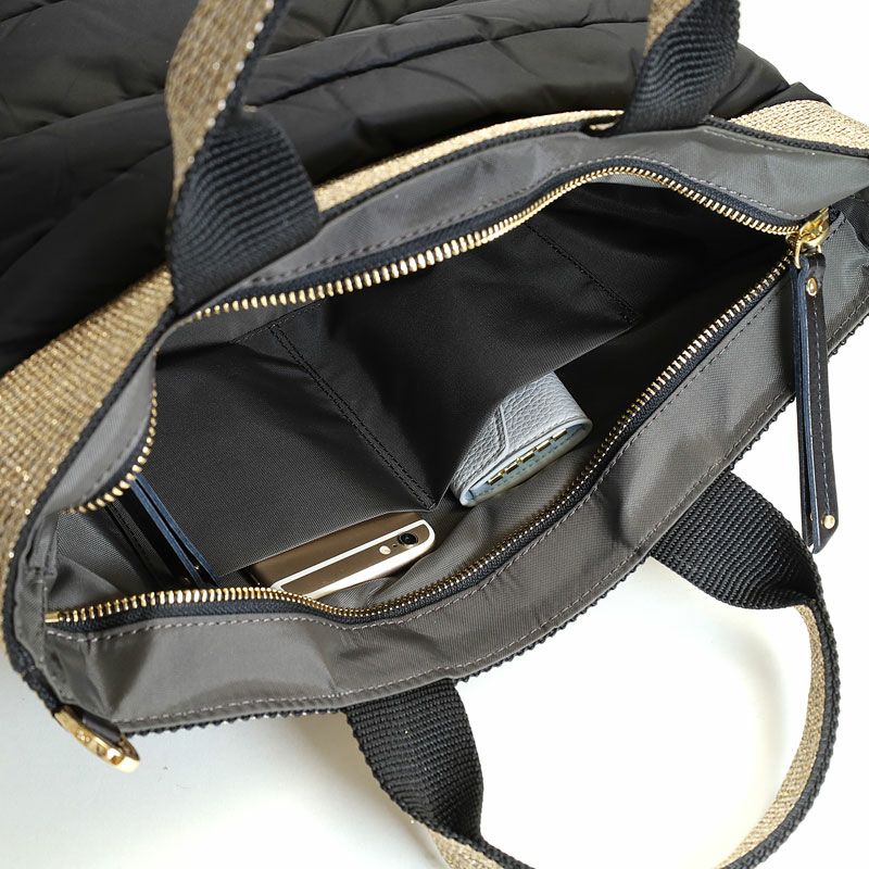 ベーシックなフォルムにゴールドのテープが印象的なナイロンタイプの2種類の2wayトート