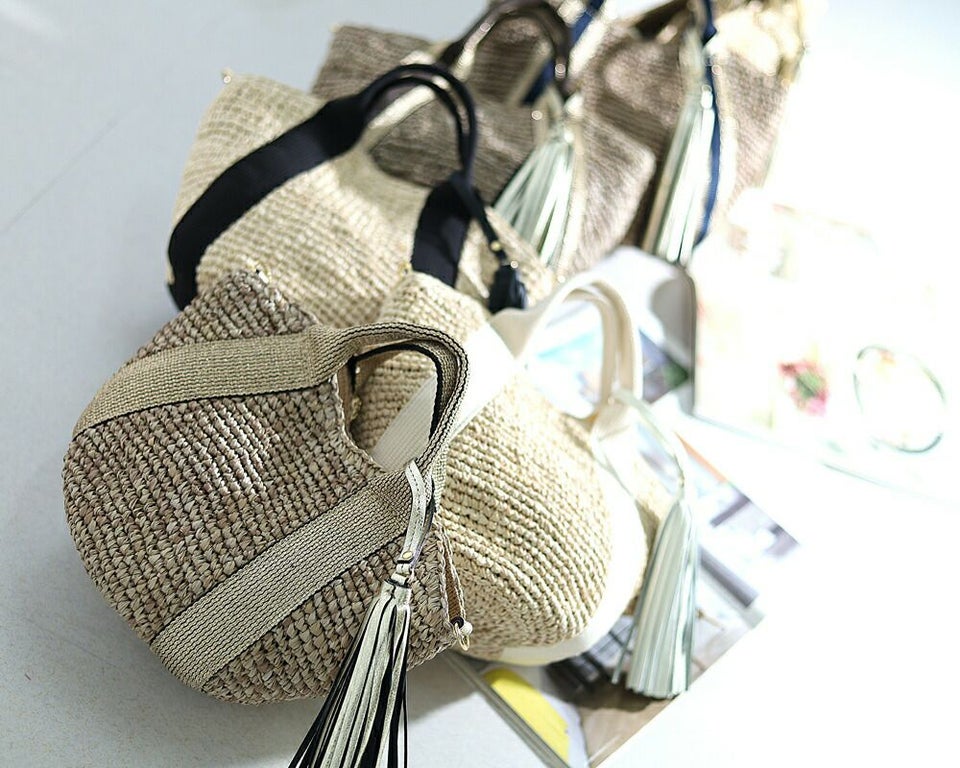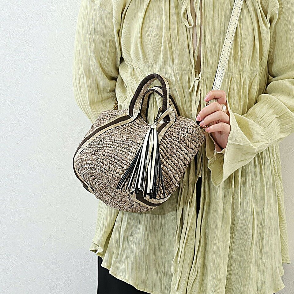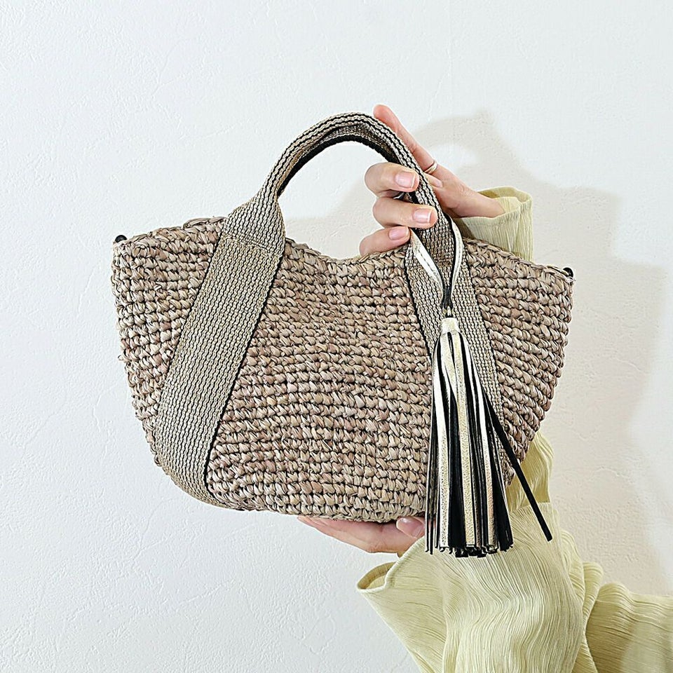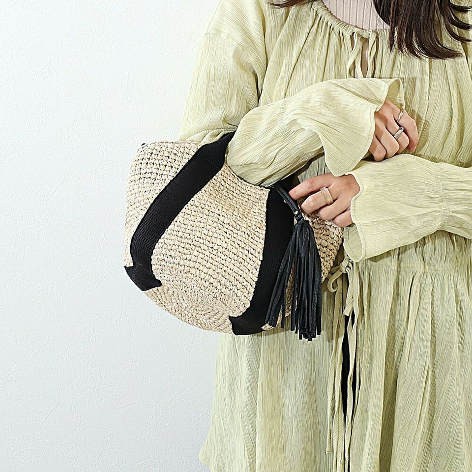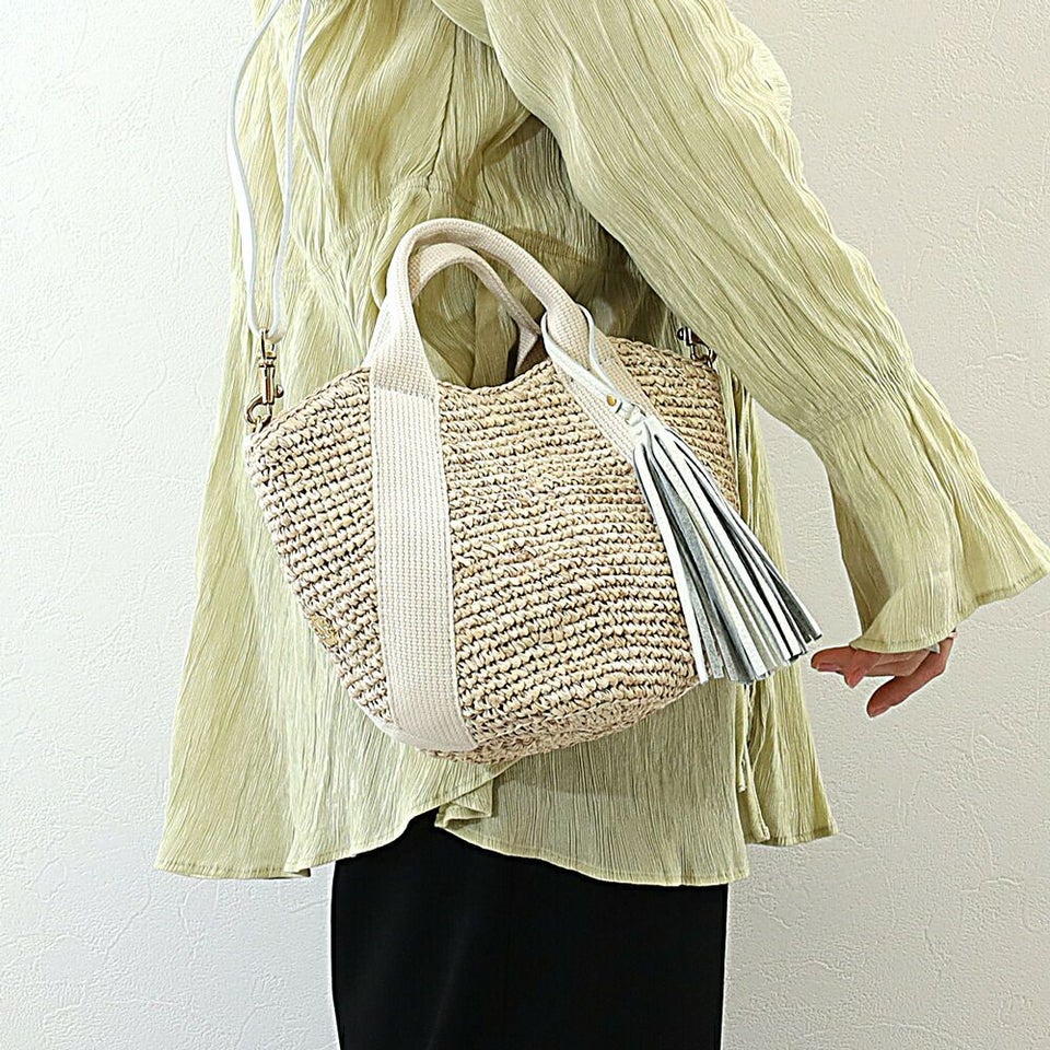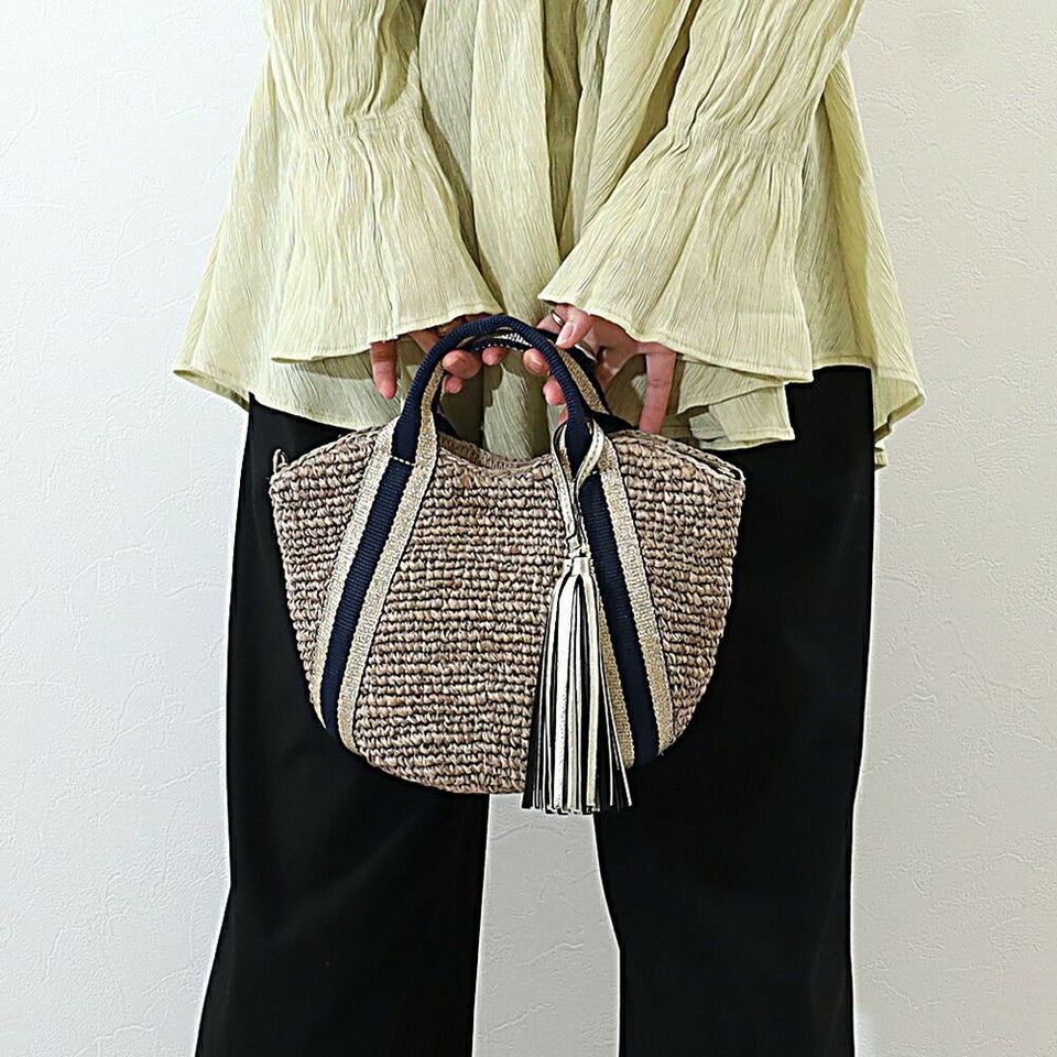 ラフィアで編み上げたボディにテープのハンドルがアクセントになったカゴバッグ。