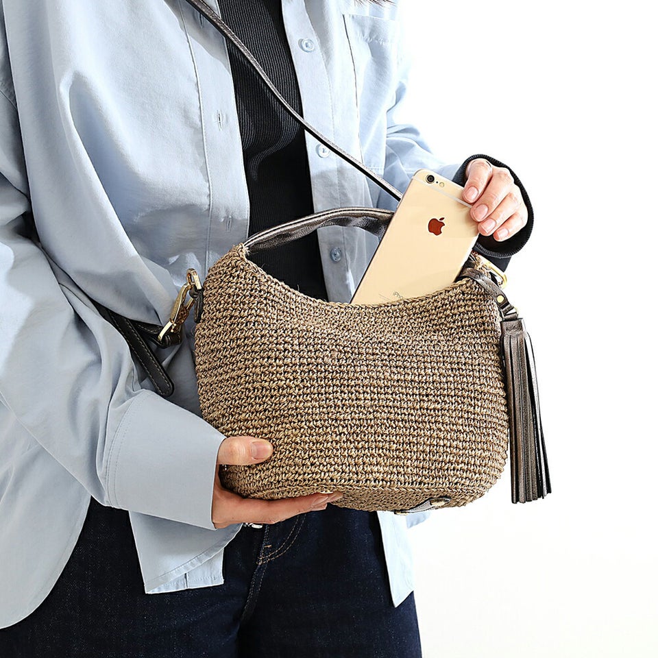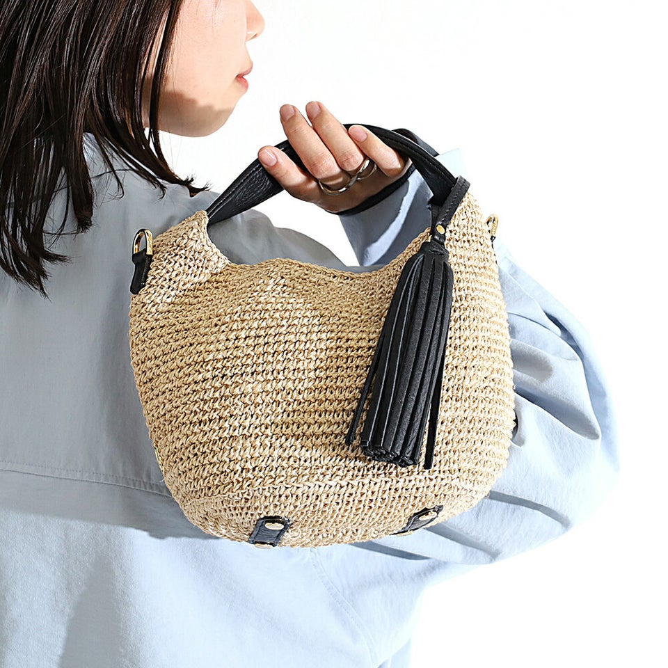 小ぶりで丸みのあるフォルムが魅力のミニサイズ。コロンとしたシルエットがスタイリングのアクセントになり、持つだけで季節感のある軽やかな印象を演出します。コンパクトながらも長財布やスマートフォンなど必要なアイテムが収まる実用的なサイズ感。可愛らしさと使いやすさを兼ね備えたデザインです。