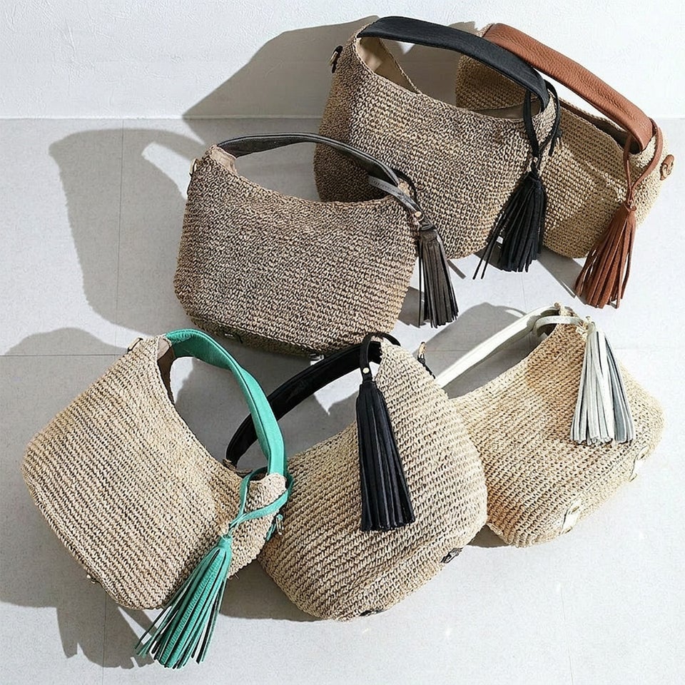 天然素材のアバカ繊維を丁寧に撚り上げたファインアバカを使用。繊細で整った編み目が美しく、ナチュラルな風合いの中に上品さを感じられる仕上がりです。軽やかな素材感でありながら、大人のスタイルにも自然に馴染むのが魅力。ヴィオラドーロらしい洗練された雰囲気を楽しめる、きれいめに持てるかごバッグです。