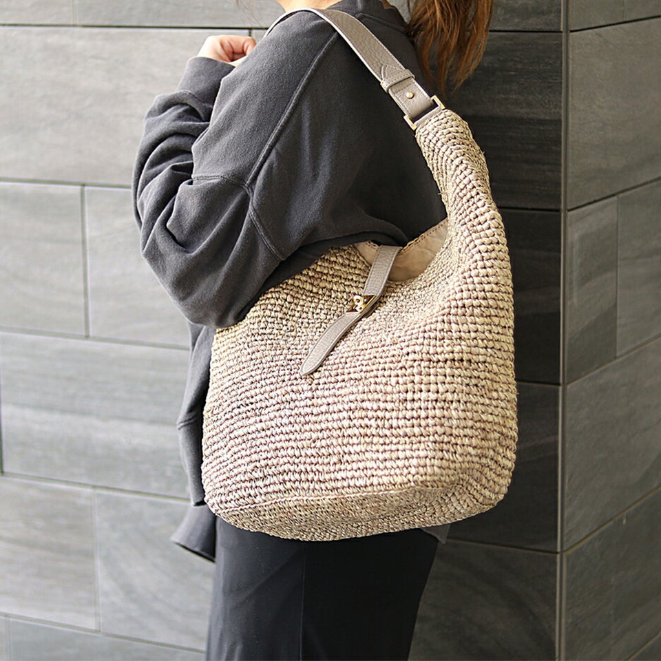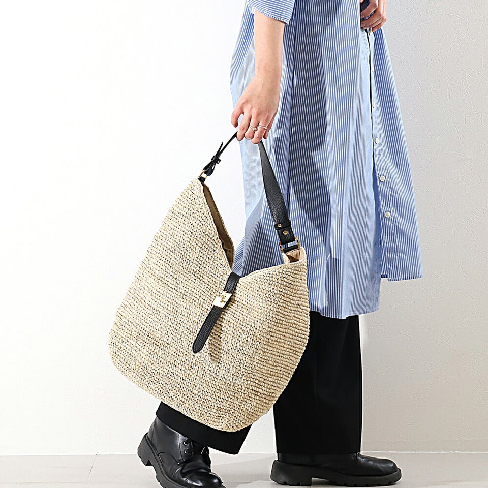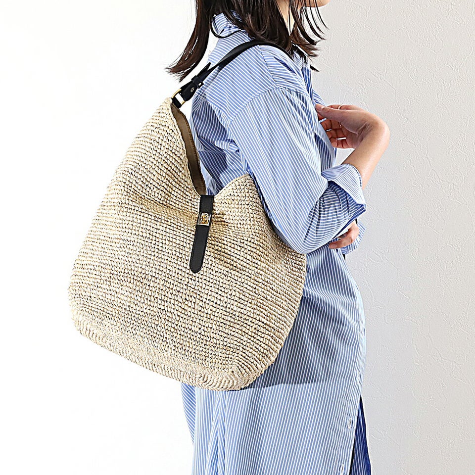 肩に掛けやすいワンショルダー仕様で、自然な持ち心地を実現。身体にフィットしやすく、長時間持ってもストレスを感じにくい設計です。ラフィアの柔らかな雰囲気とレザーハンドルの組み合わせが、カジュアルすぎない上品なスタイルを演出します。