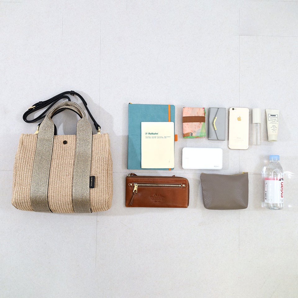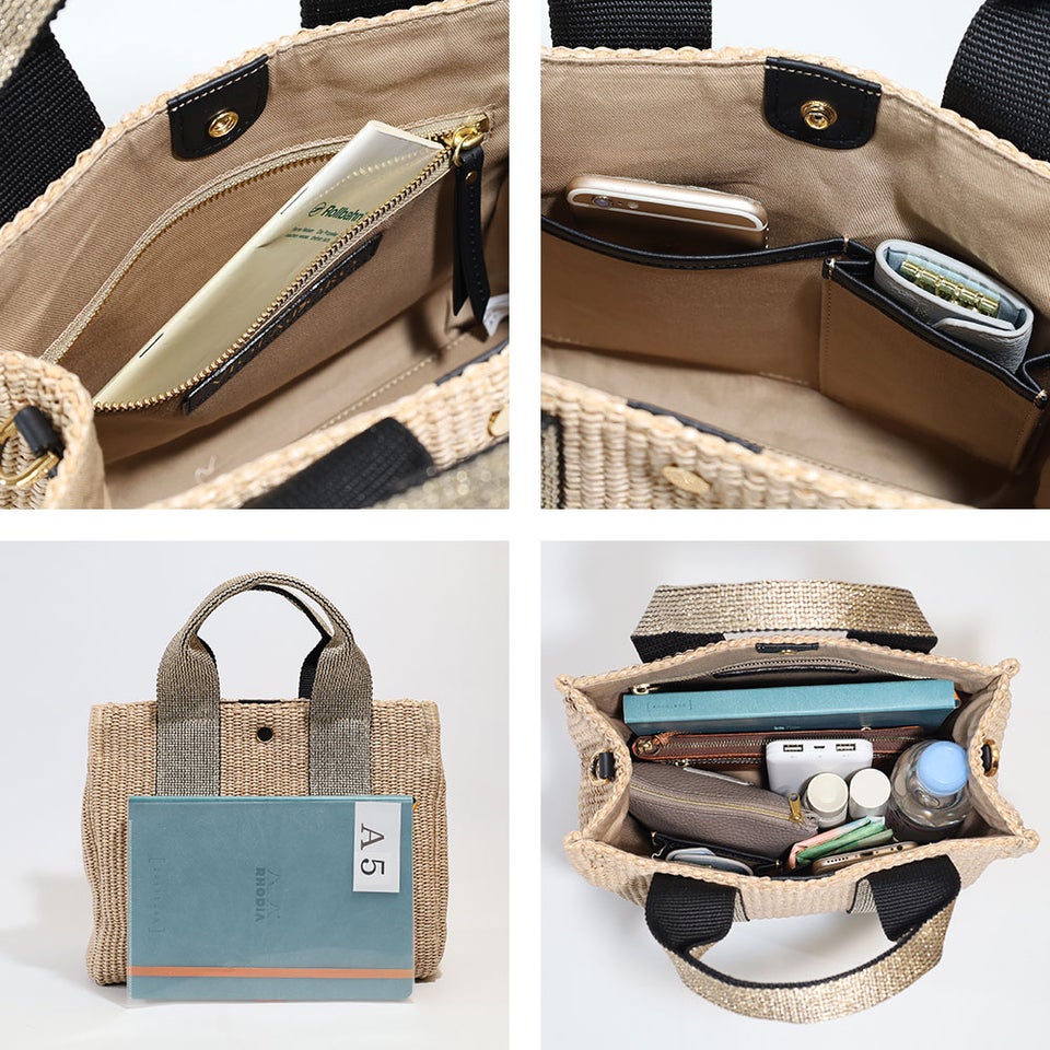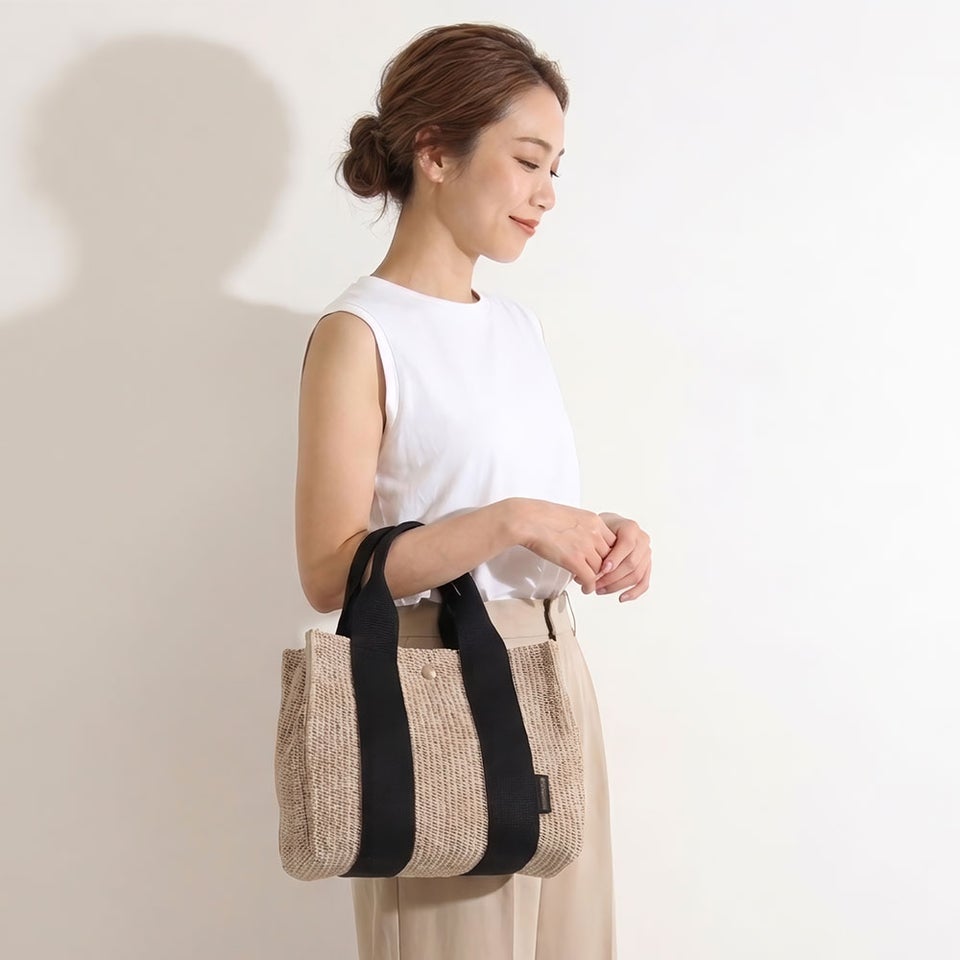 バッグの内側には底板が付いているため、荷物を入れても形が崩れにくく美しいシルエットをキープします。中身が安定して収納できるので、使い心地も快適。ナチュラル素材の軽やかさと実用性を兼ね備え、見た目の上品さだけでなく機能面にも配慮されたデザインです。毎日の外出にも安心して使えます。