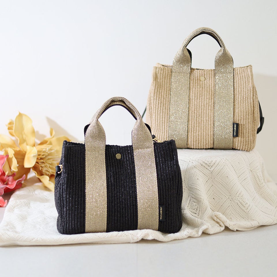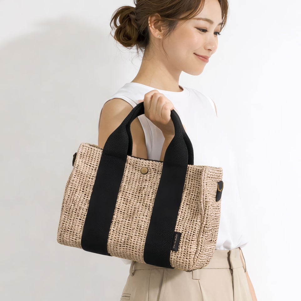 ラフィアのような軽やかな風合いを持つシート素材を使用。天然素材のようなナチュラルな表情を楽しみながら、程よいハリ感がありバッグの形をきれいに保ちます。カジュアルな雰囲気と上品さを兼ね備えているため、普段のスタイルからきれいめなコーディネートまで幅広く合わせやすいのが魅力です。