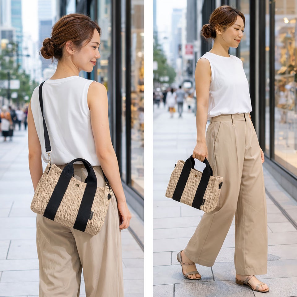 手持ちのトートバッグとしてはもちろん、付属のショルダーストラップを使えば斜め掛けもできる2WAY仕様。両手が空くためショッピングや旅行などにも便利です。シーンやコーディネートに合わせて持ち方を変えられるため、日常のお出かけからお出かけシーンまで幅広く活躍する使い勝手の良いバッグです。