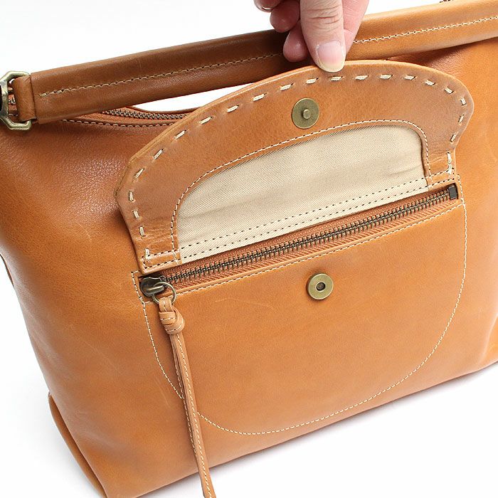 ワンポイントになるレザータグ付きです。背面にはファスナーポケット、前面にはマグネット&ファスナーポケットがあり、スマートフォンやパスケースなど使用頻度の高いさっと取り出したい物を入れておくのに便利です。