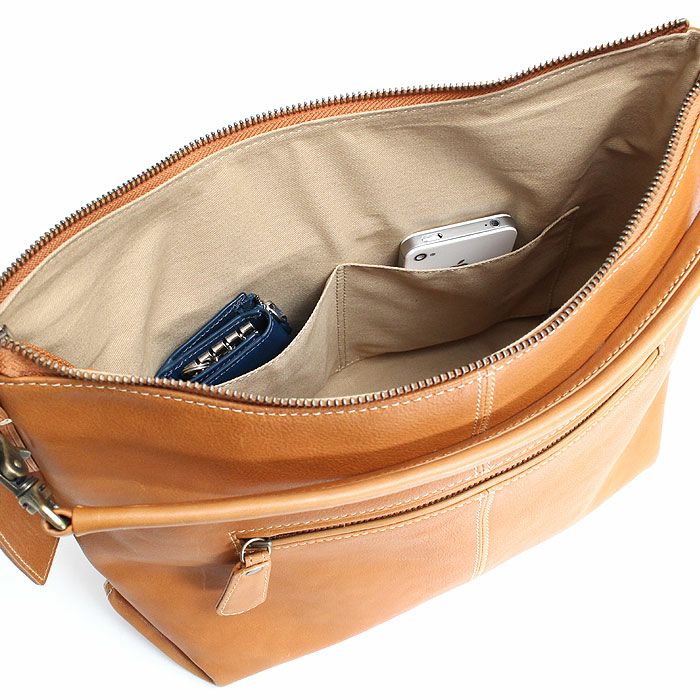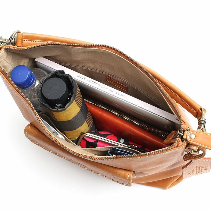 白い太めのステッチが効いたシンプルなデザインで、 程よいマチ幅で体にフィットします。