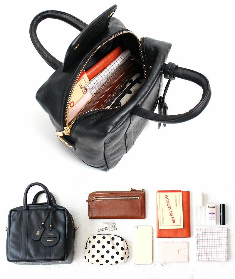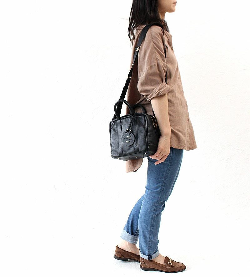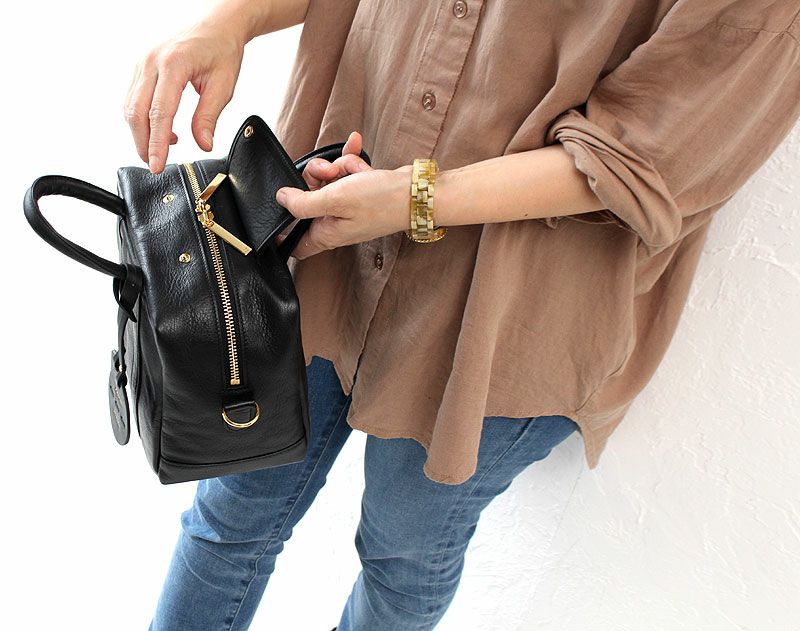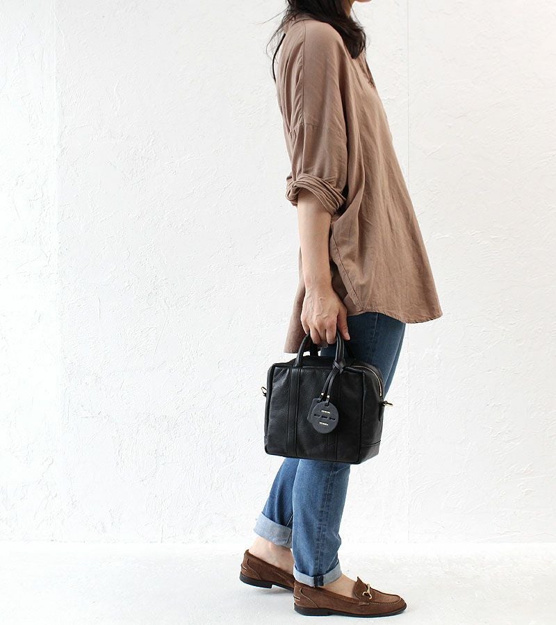 またショルダーストラップのナスカンなどの金具使いやカバンの底部分に施したステッチワークなど、 シンプルなデザインながらも、存在感のある佇まいも魅力的です。
