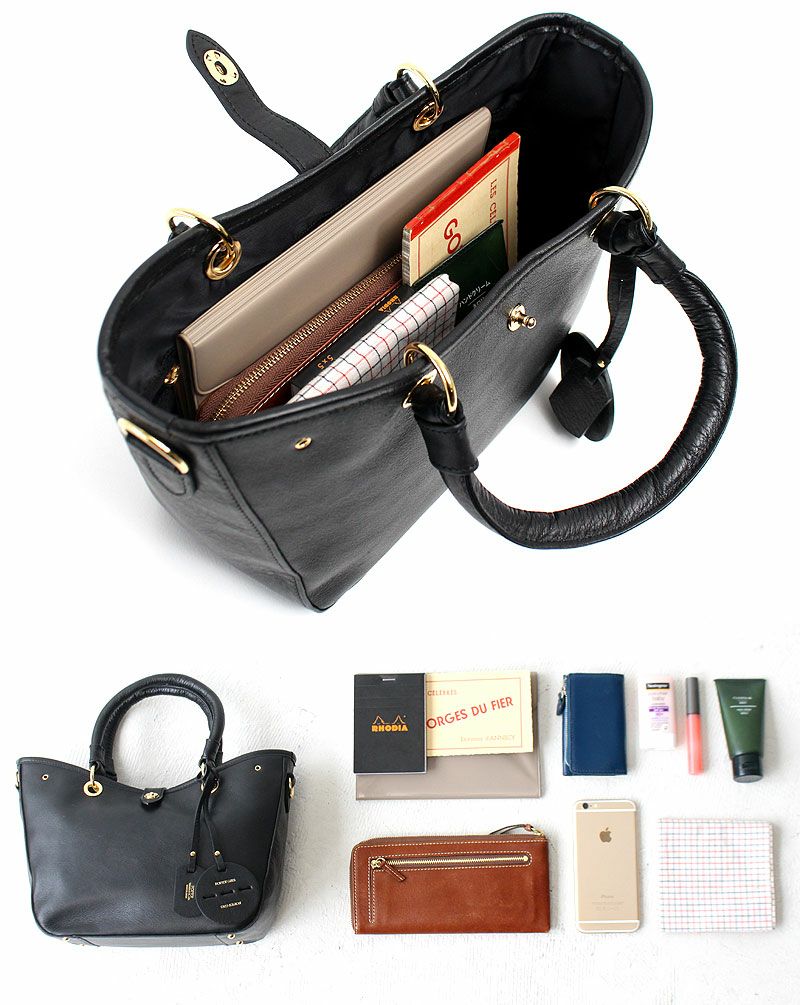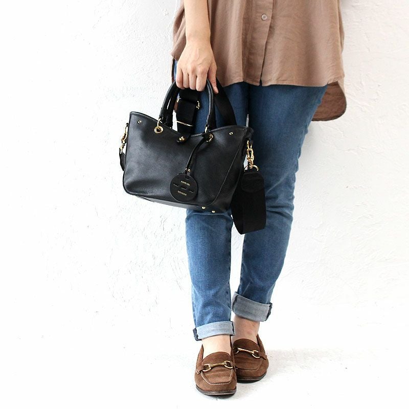 2WAYトートバッグは、コンパクトなサイズながらも長財布やスマートフォンなどが収納できるので、 普段使いからパーティーシーンなどでも使いやすいサイズです。