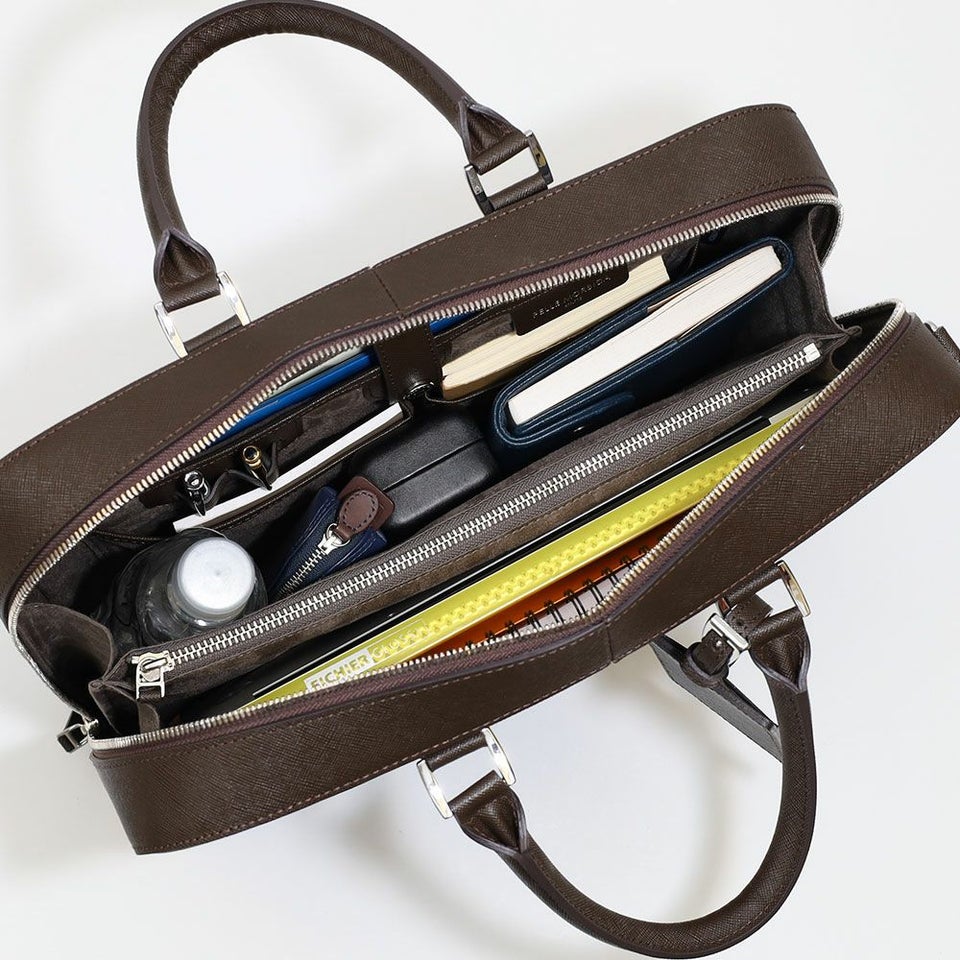 ウレタン入りポケットやペンホルダー、仕切り付きのメイン収納など、整理しやすく使い勝手の良い構造。底びょう付きで自立性も高く、書類やPCをすっきりと持ち運べます。