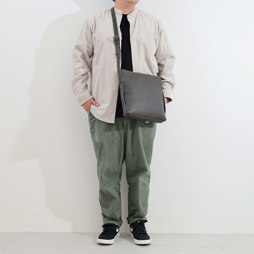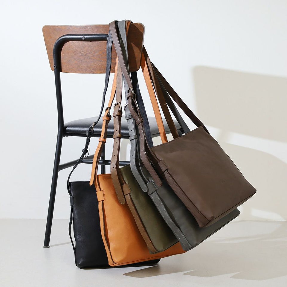装飾を抑えたミニマルなデザインは、素材の魅力を引き立てるためのこだわり。縦型フォルムとスリムなマチ(5cm)がスタイリッシュな印象を与え、どんなコーディネートにも自然に馴染みます。