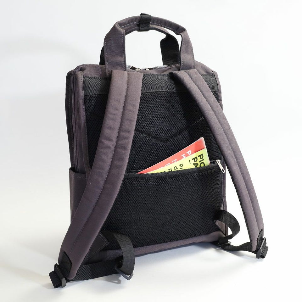 A4サイズがすっきり収まり、ポケットも豊富で整理整頓がしやすい。背面にはセキュリティポケット付きで防犯性も◎。トート持ちのときにショルダーベルトが垂れない工夫も嬉しいポイントです。