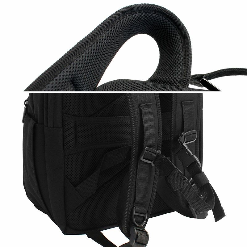 ショルダー、本体の背面は通気性に優れたメッシュ素材。また、ショルダーにはチェストベルトが付属します。