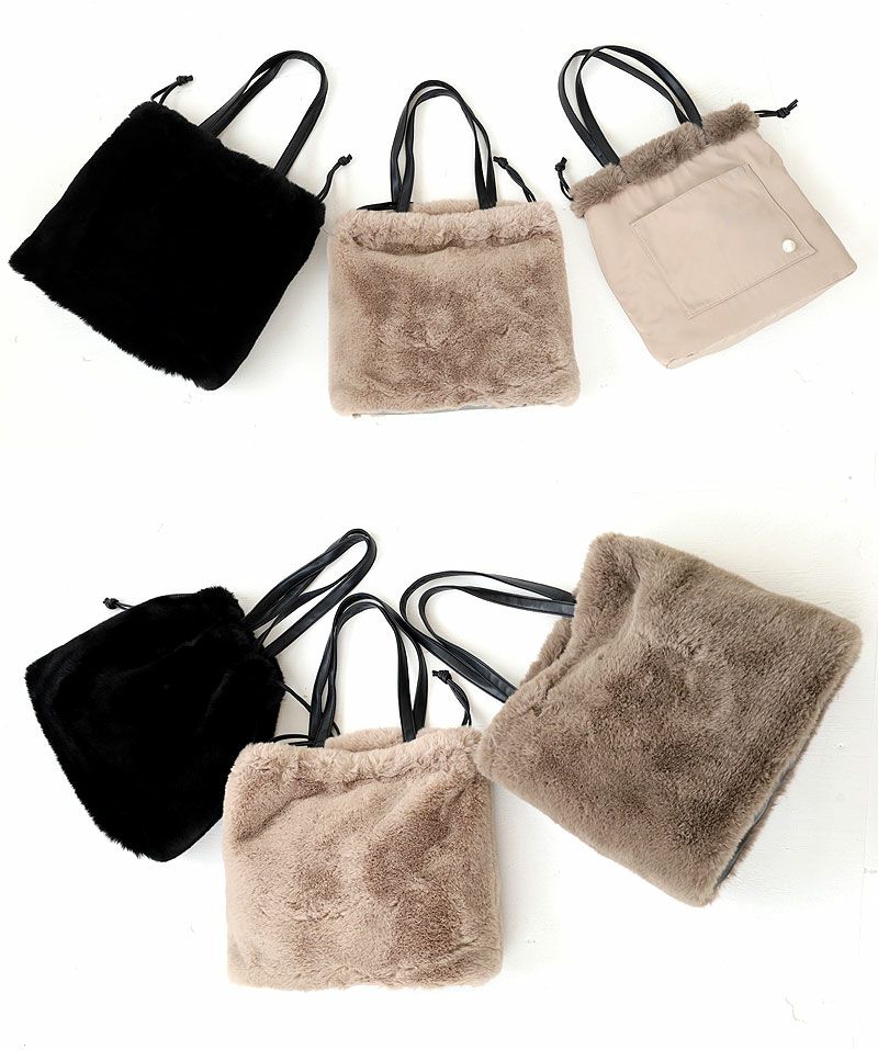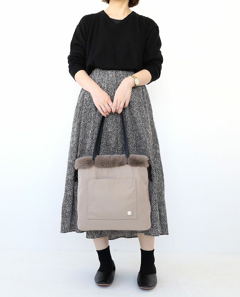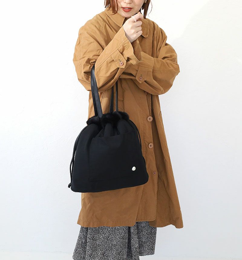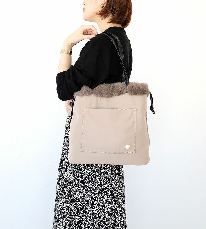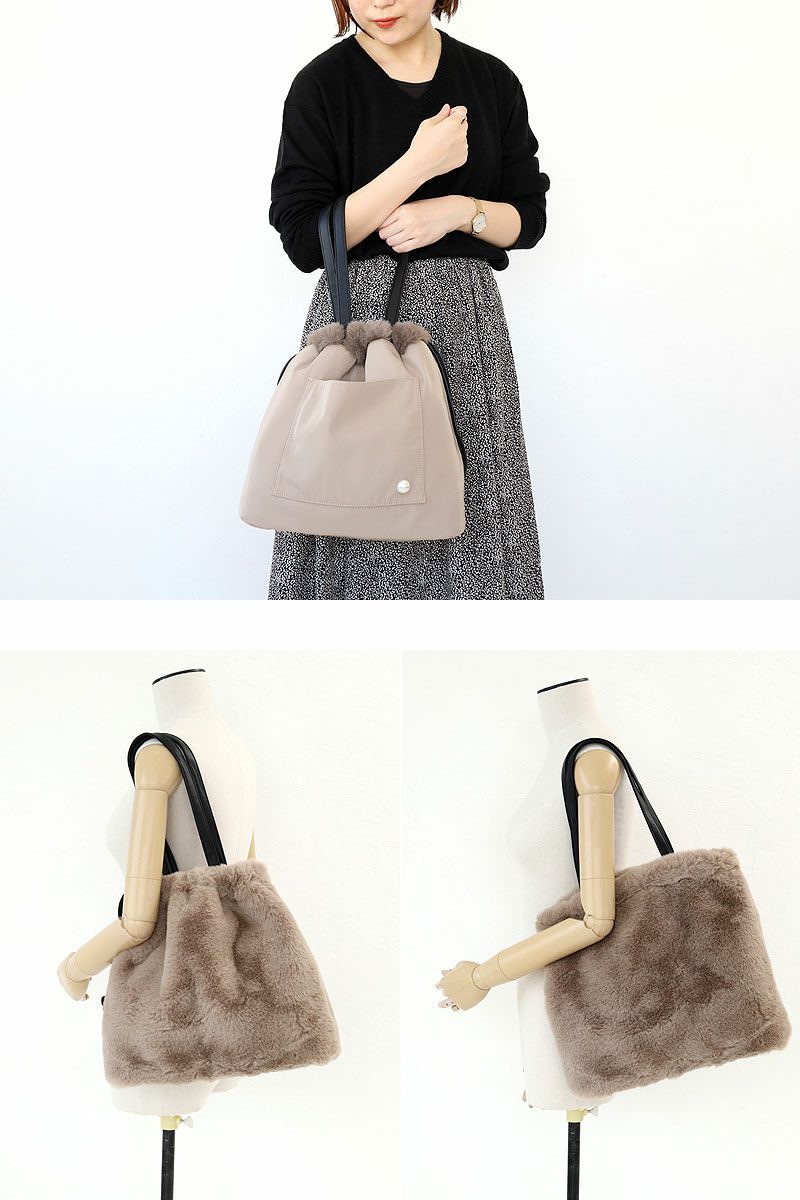 かわいいファー巾着トートにもなり、様々なフォルムになるので 気分によって色々と変えられるのが嬉しいところ。