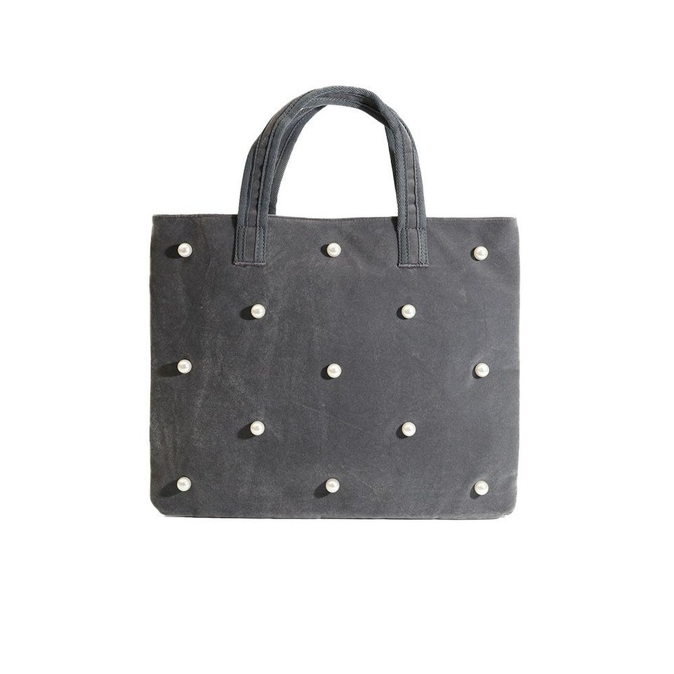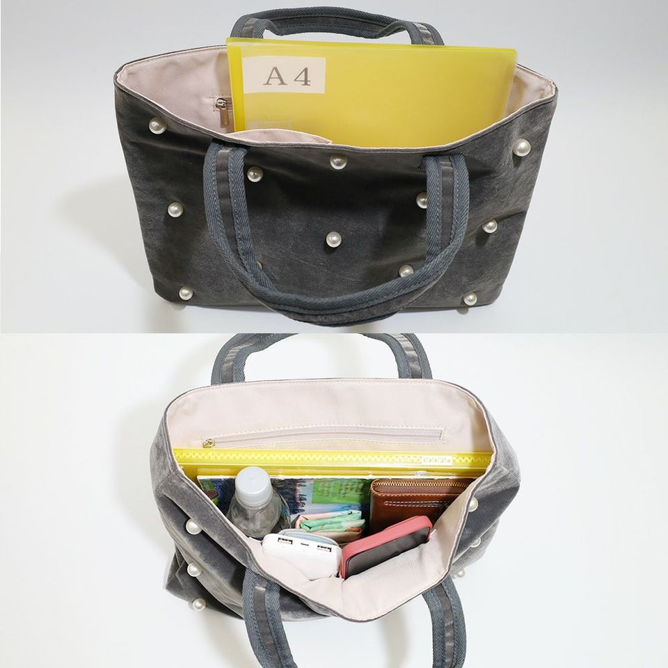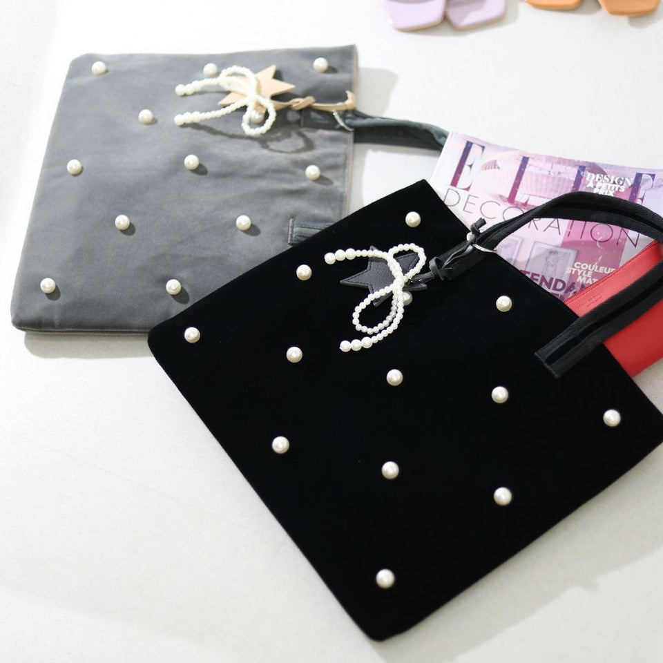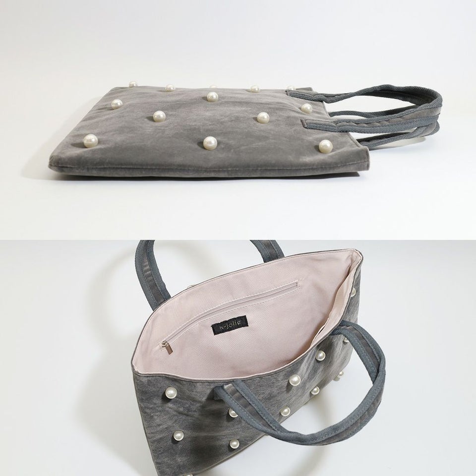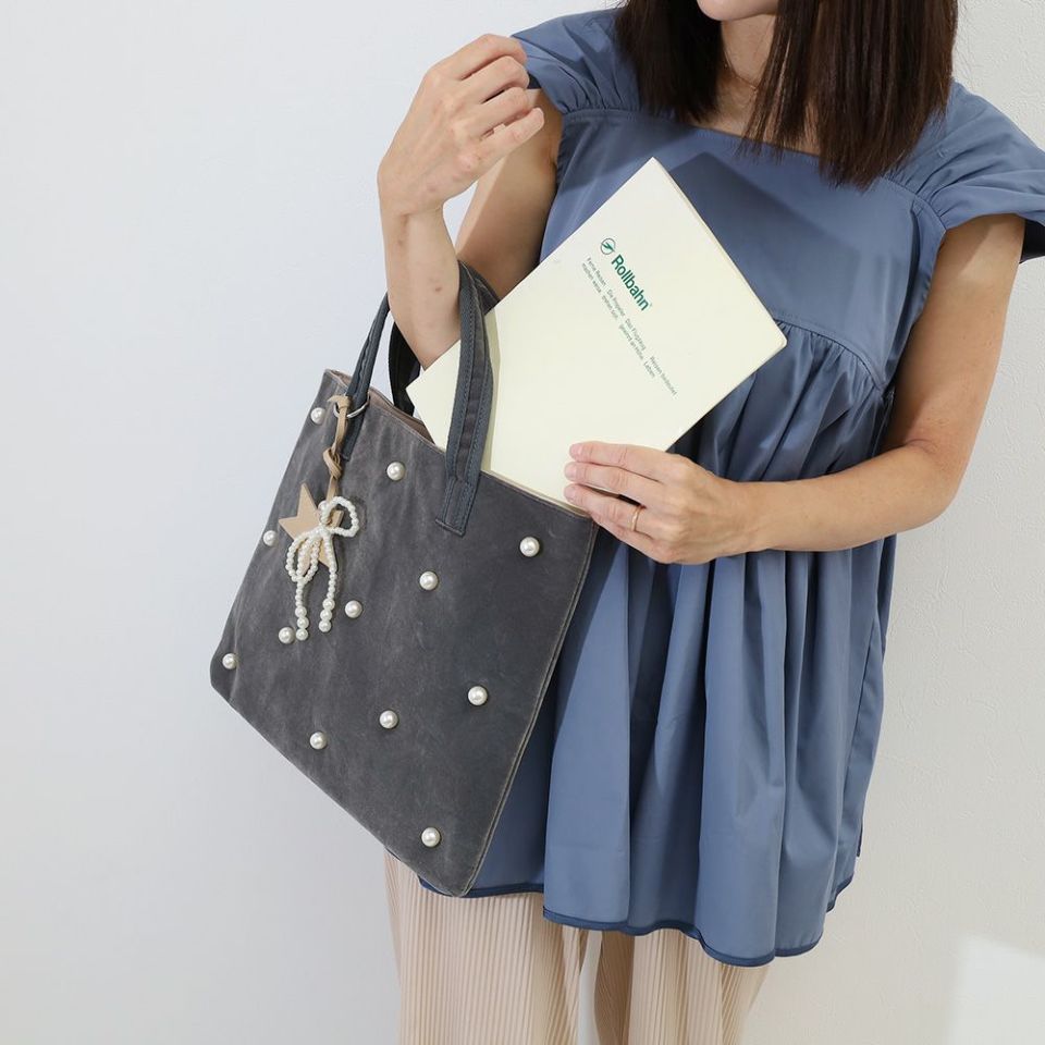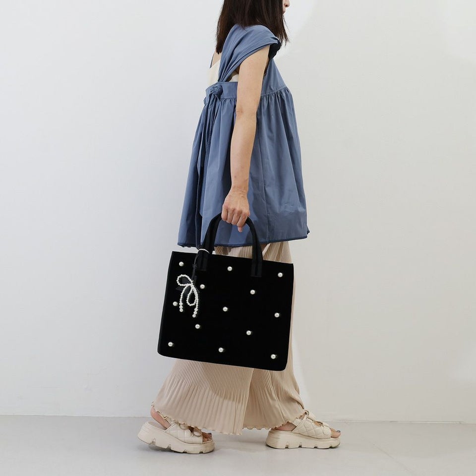 a-jolieらしい遊び心と上品さが融合。トート全体に散りばめられたパールが、動くたびに光を反射し、持つだけで華やかな印象に仕上がります。
