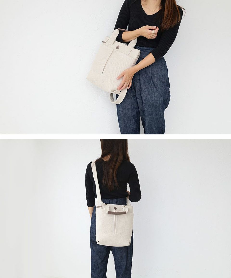 コットンジュートを一度洗いにかけたウォッシュドコットンジュートで仕立てた2WAYバッグ。